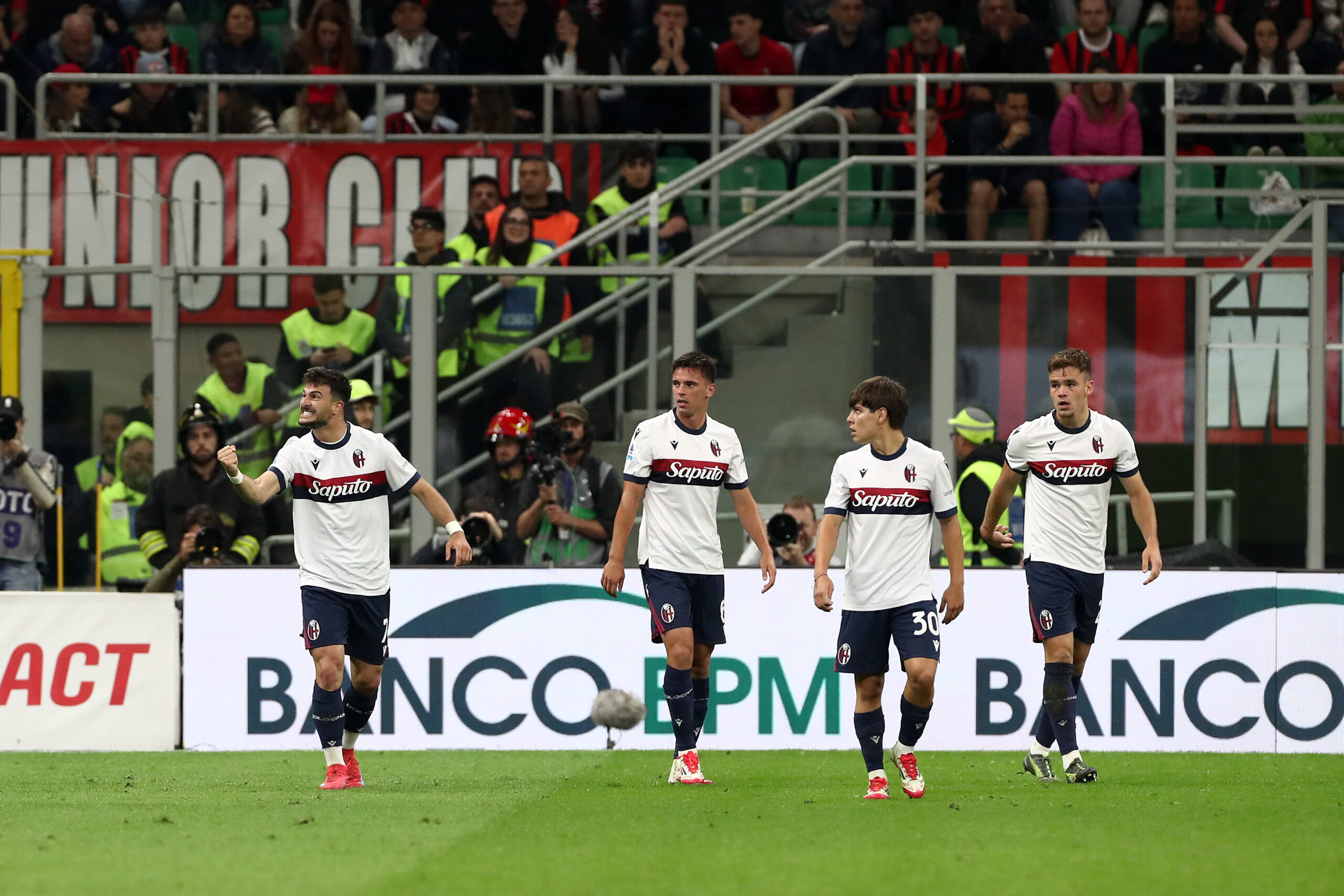 MILAN, ITALY - MAY 09: Riccardo Orsolini of Bologna celebrates scoring his team's first goal with teammates during the Serie A match between AC Milan and Bologna at Stadio Giuseppe Meazza on May 09, 2025 in Milan, Italy. (Photo by Marco Luzzani/Getty Images)