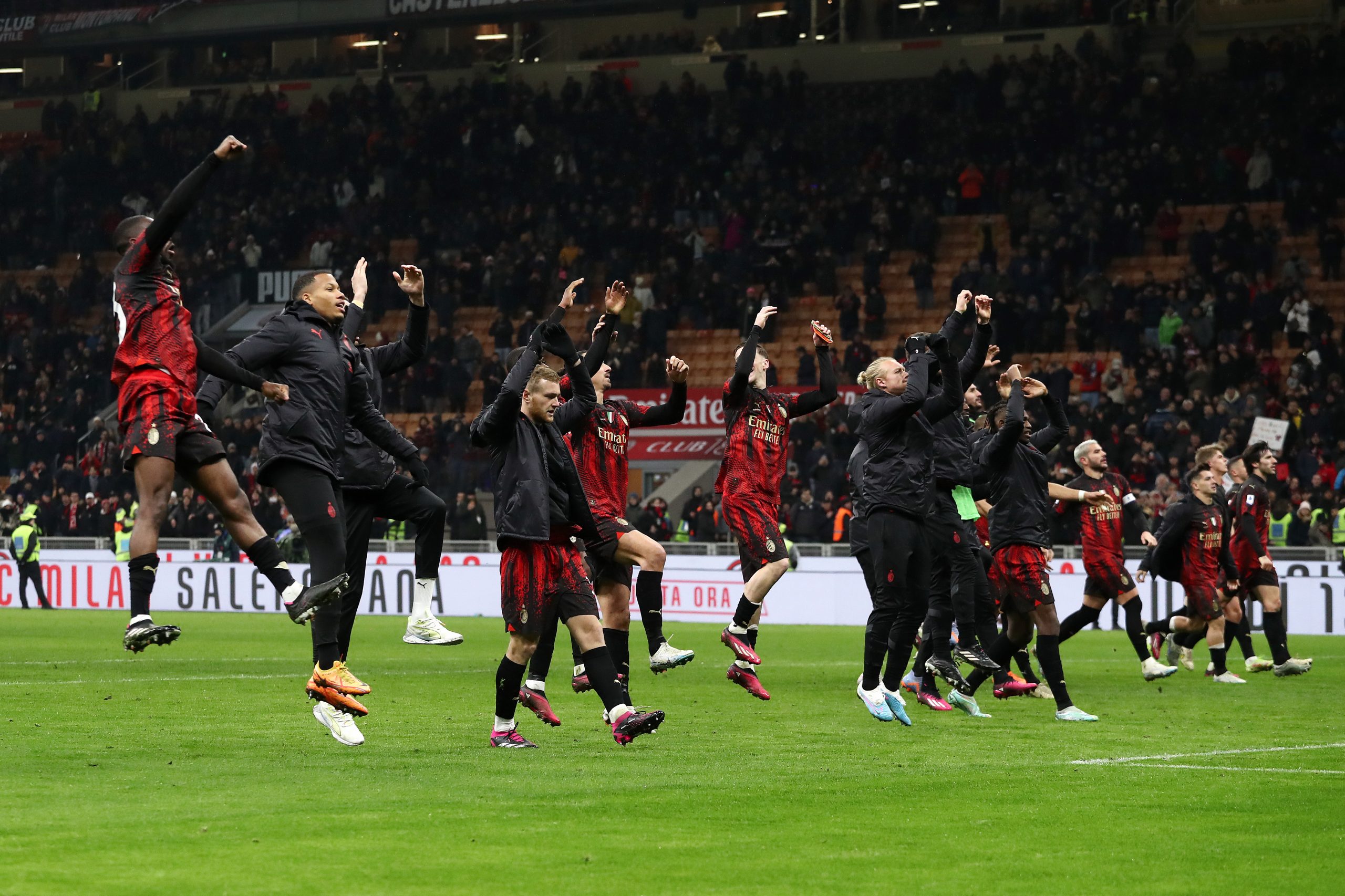 MILAN, ITALY - FEBRUARY 26: A general view as players of AC Milan celebrate their victory in front of their fans after the Serie A match between AC MIlan and Atalanta BC at Stadio Giuseppe Meazza on February 26, 2023 in Milan, Italy. (Photo by Marco Luzzani/Getty Images)