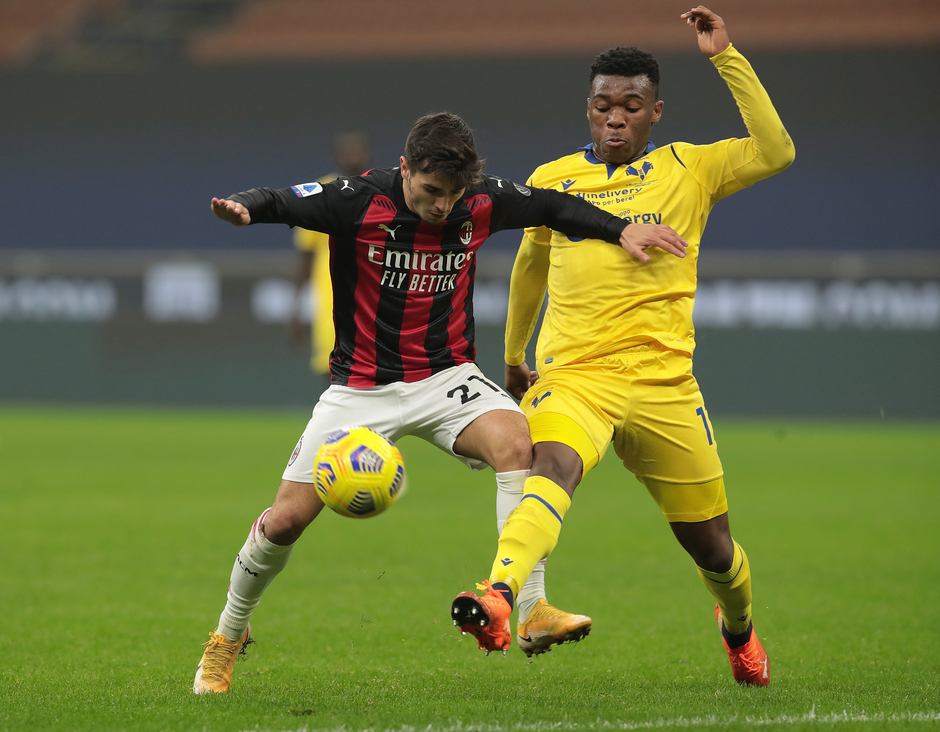 MILAN, ITALY - NOVEMBER 08: Brahim Diaz (L) of AC Milan is challenged by Destiny Udogie of Hellas Verona during the Serie A match between AC Milan and Hellas Verona FC at Stadio Giuseppe Meazza on November 8, 2020 in Milan, Italy. (Photo by Emilio Andreoli/Getty Images)