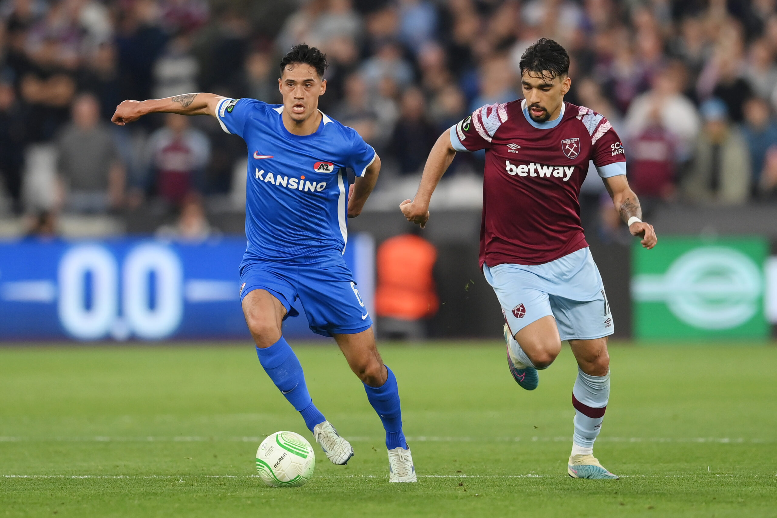 LONDON, ENGLAND - MAY 11: Tijjani Reijnders of AZ Alkmaar runs with the ball whilst under pressure from Lucas Paqueta of West Ham United during the UEFA Europa Conference League semi-final first leg match between West Ham United and AZ Alkmaar at London Stadium on May 11, 2023 in London, England. (Photo by Shaun Botterill/Getty Images)