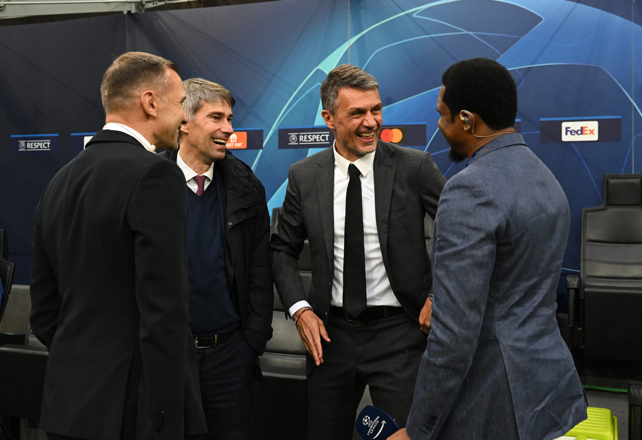 MILAN, ITALY - MAY 10: Andrij Shevchenko ,Paolo Maldini , Samuel Eto and Frederic Massara of AC Milan attend before the UEFA Champions League semi-final first leg match between AC Milan and FC Internazionale at San Siro on May 10, 2023 in Milan, Italy. (Photo by Claudio Villa/AC Milan via Getty Images)