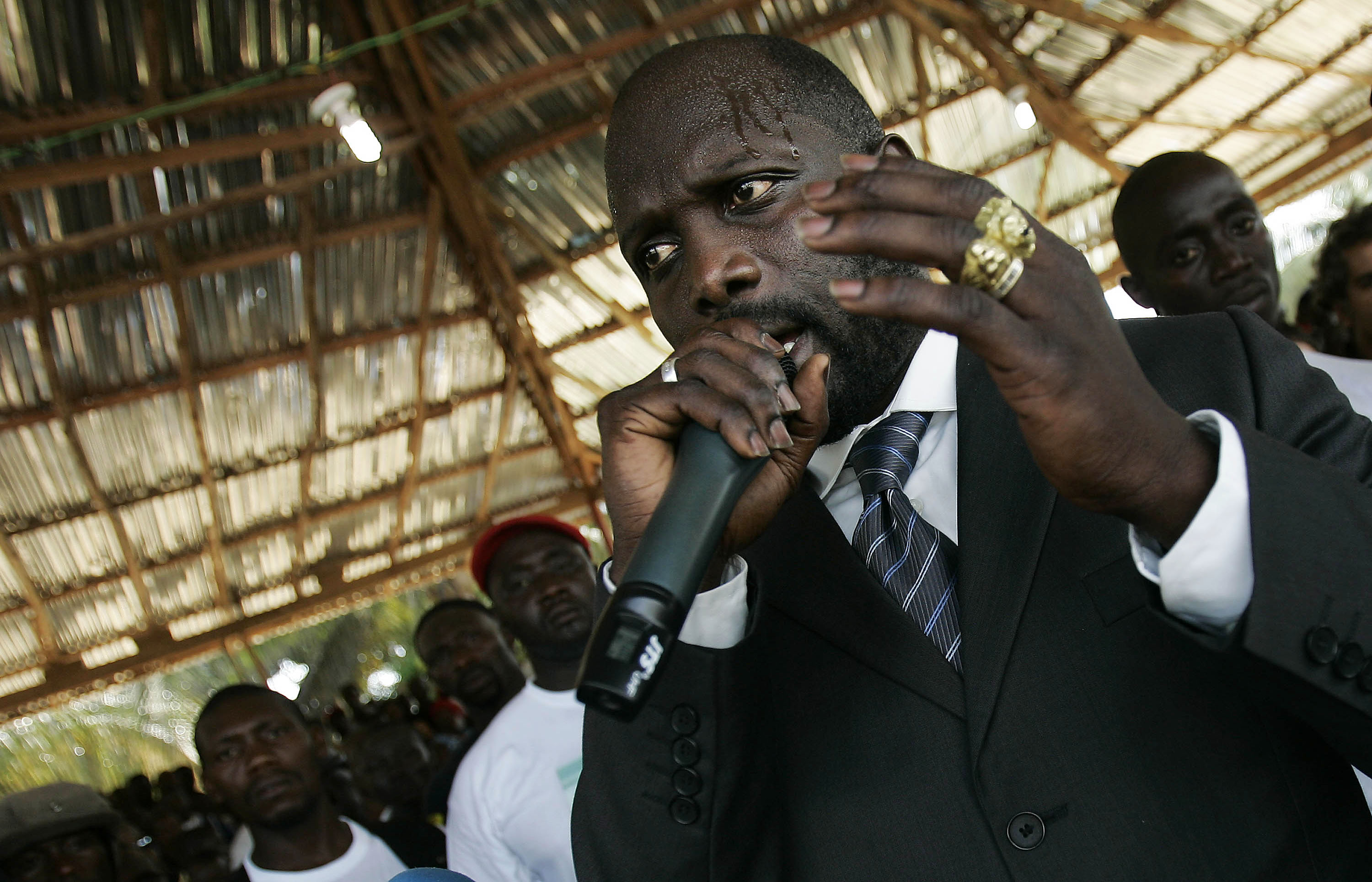 MONROVIA, LIBERIA - NOVEMBER 11: Liberian presidential contender George Weah speaks to supporters November 11, 2005 in Monrovia, Liberia. Supporters of ex-international soccer star George Weah have taken to the streets after his apparent election loss to Harvard-educated economist Ellen Johnson Sirleaf, who holds a commanding lead. Weah's camp is alleging "massive fraud" in the internationally-monitored elections but is urging his supporters, many of them young and disaffected former combatants, not to riot. (Photo by Chris Hondros/Getty Images)