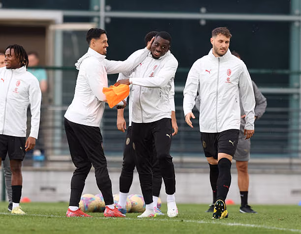 ROME, ITALY - MAY 13: Tijjani Reijnders and Youssouf Fofana of AC Milan in action during AC Milan training session at Centro Sportivo Giulio Onesti on May 13, 2025 in Rome, Italy. (Photo by Claudio Villa/AC Milan via Getty Images)