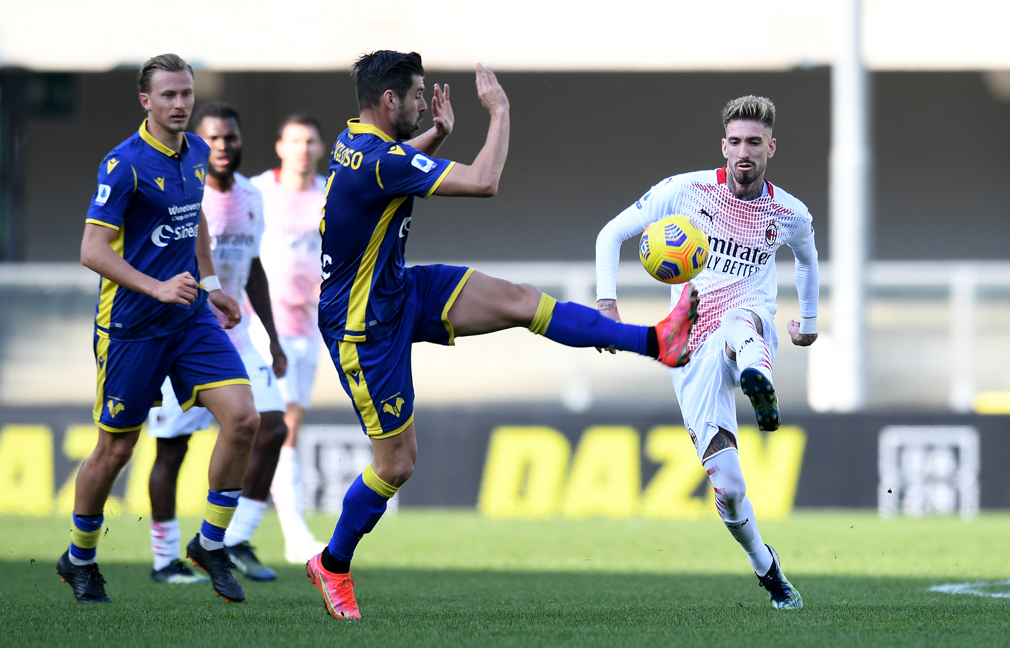 VERONA, ITALY - MARCH 07: Miguel Veloso of Hellas Verona and Samu Castillejo of A.C. Milan battle for possession during the Serie A match between Hellas Verona FC and AC Milan at Stadio Marcantonio Bentegodi on March 07, 2021 in Verona, Italy. Sporting stadiums around Italy remain under strict restrictions due to the Coronavirus Pandemic as Government social distancing laws prohibit fans inside venues resulting in games being played behind closed doors. (Photo by Alessandro Sabattini/Getty Images)