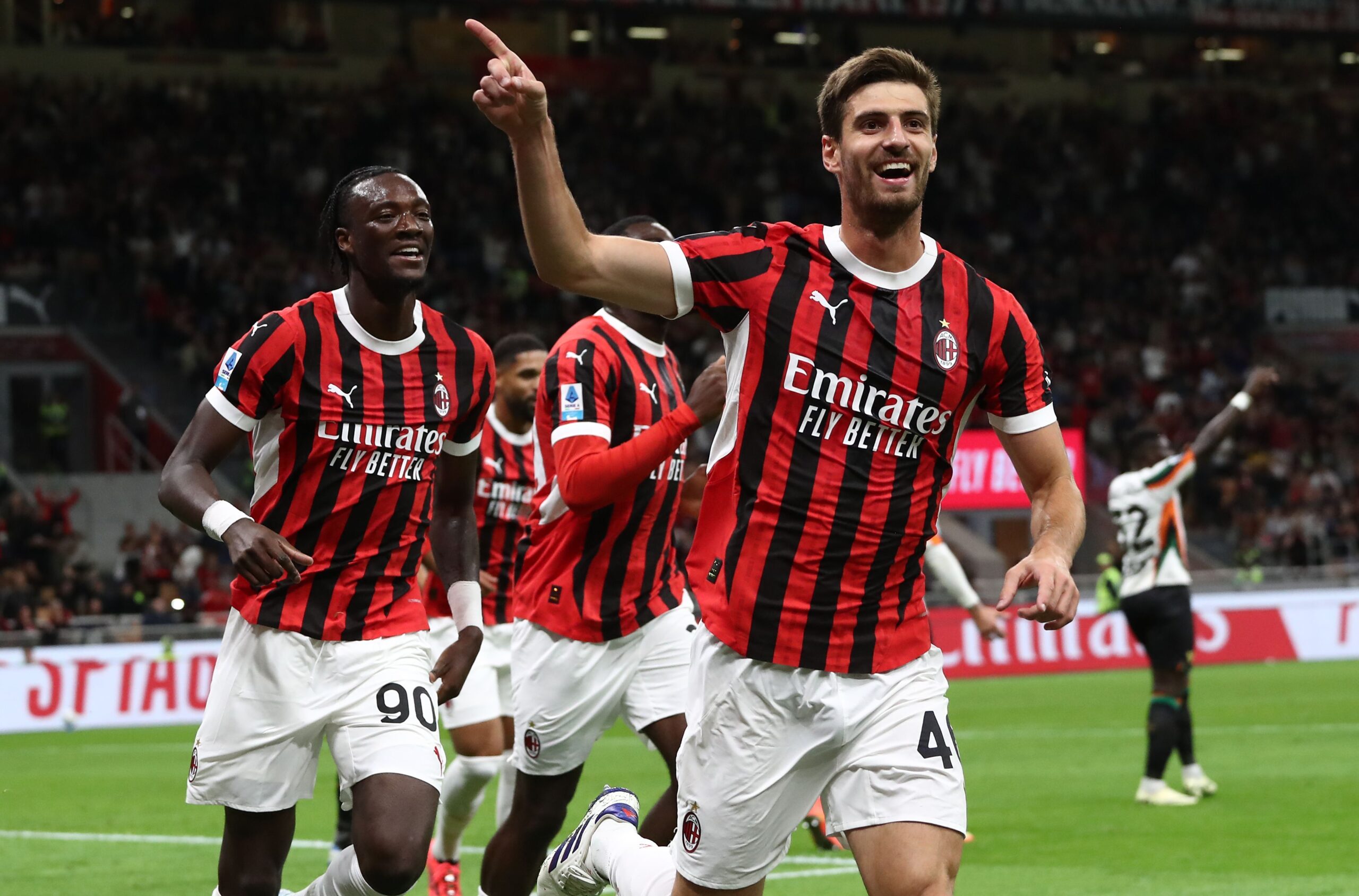 MILAN, ITALY - SEPTEMBER 14: Matteo Gabbia of AC Milan celebrates his goal during the Serie A match between AC Milan and Venezia at Stadio Giuseppe Meazza on September 14, 2024 in Milan, Italy. (Photo by Marco Luzzani/Getty Images)