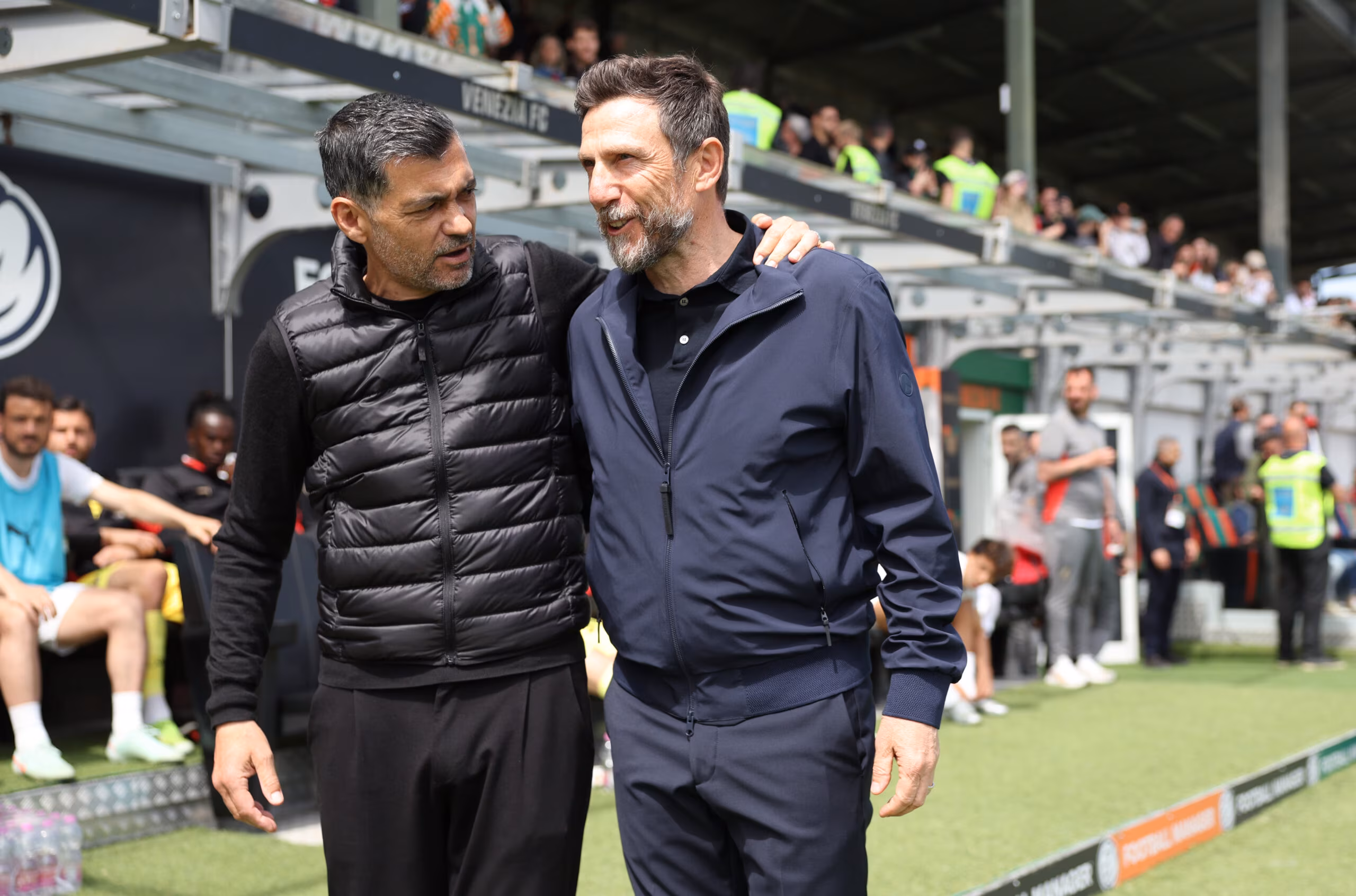 VENICE, ITALY - APRIL 27: head coach of AC Milan Sergio Conceicao and head coach of Venezia Eusebio Di Francesco observe one minute's silence in memory of Francesco Pope during the Serie A match between Venezia and Milan at Stadio Pier Luigi Penzo on April 27, 2025 in Venice, Italy. (Photo by Claudio Villa/AC Milan via Getty Images)