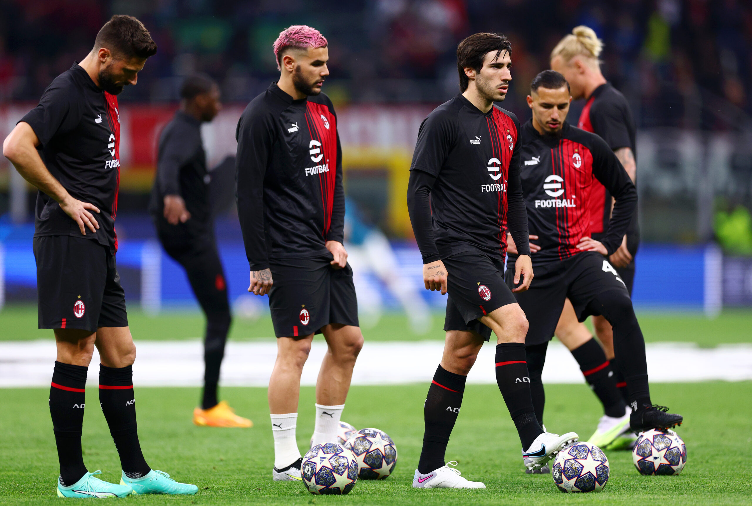 MILAN, ITALY - MAY 10: Sandro Tonali of AC Milan warms up with teammates prior to the UEFA Champions League semi-final first leg match between AC Milan and FC Internazionale at San Siro on May 10, 2023 in Milan, Italy. (Photo by Clive Rose/Getty Images)