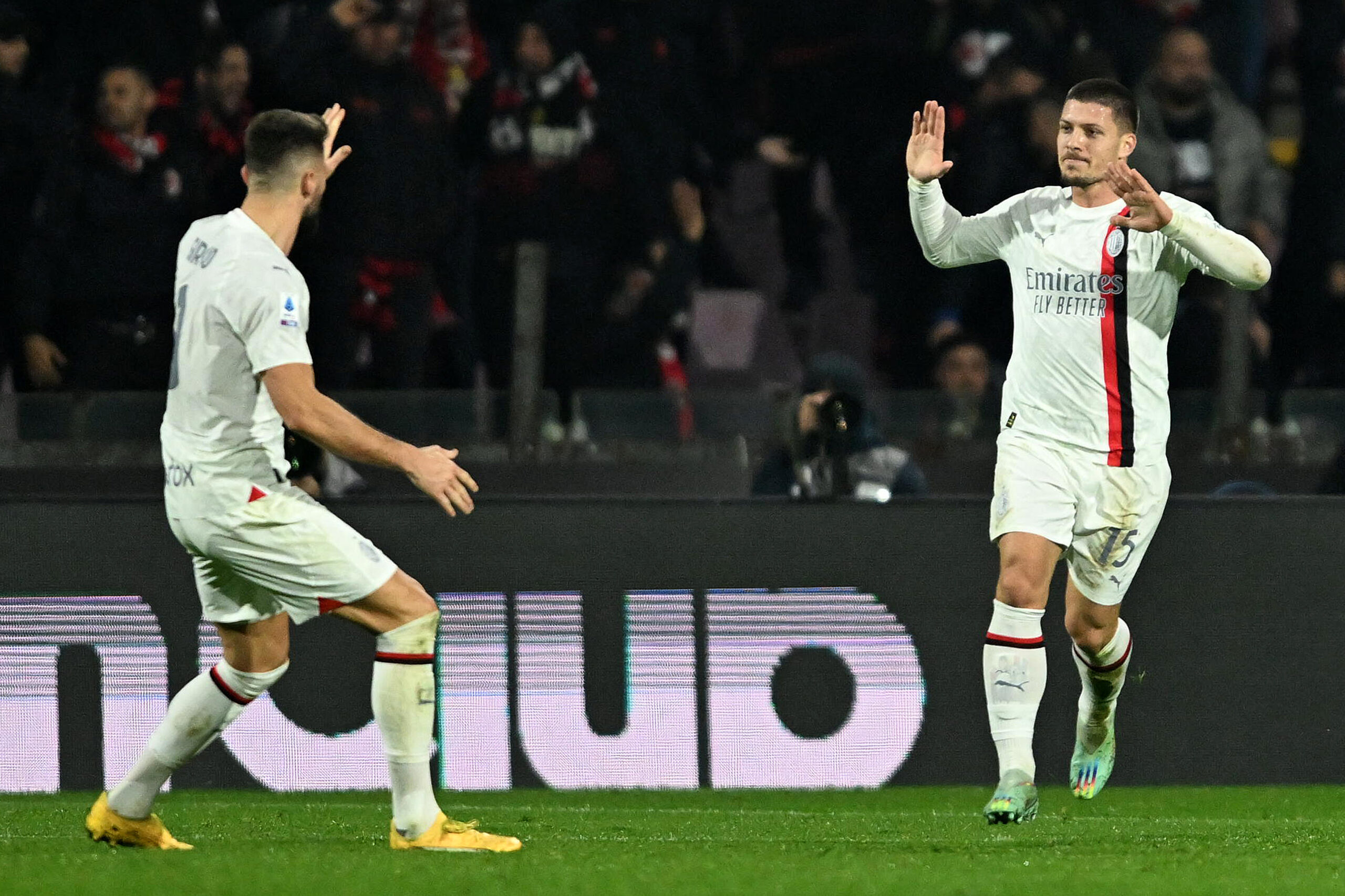 SALERNO, ITALY - DECEMBER 22: Luka Jovic of AC Milan celebrates after scoring his side second goal during the Serie A TIM match between US Salernitana and AC Milan at Stadio Arechi on December 22, 2023 in Salerno, Italy. (Photo by Francesco Pecoraro/Getty Images)