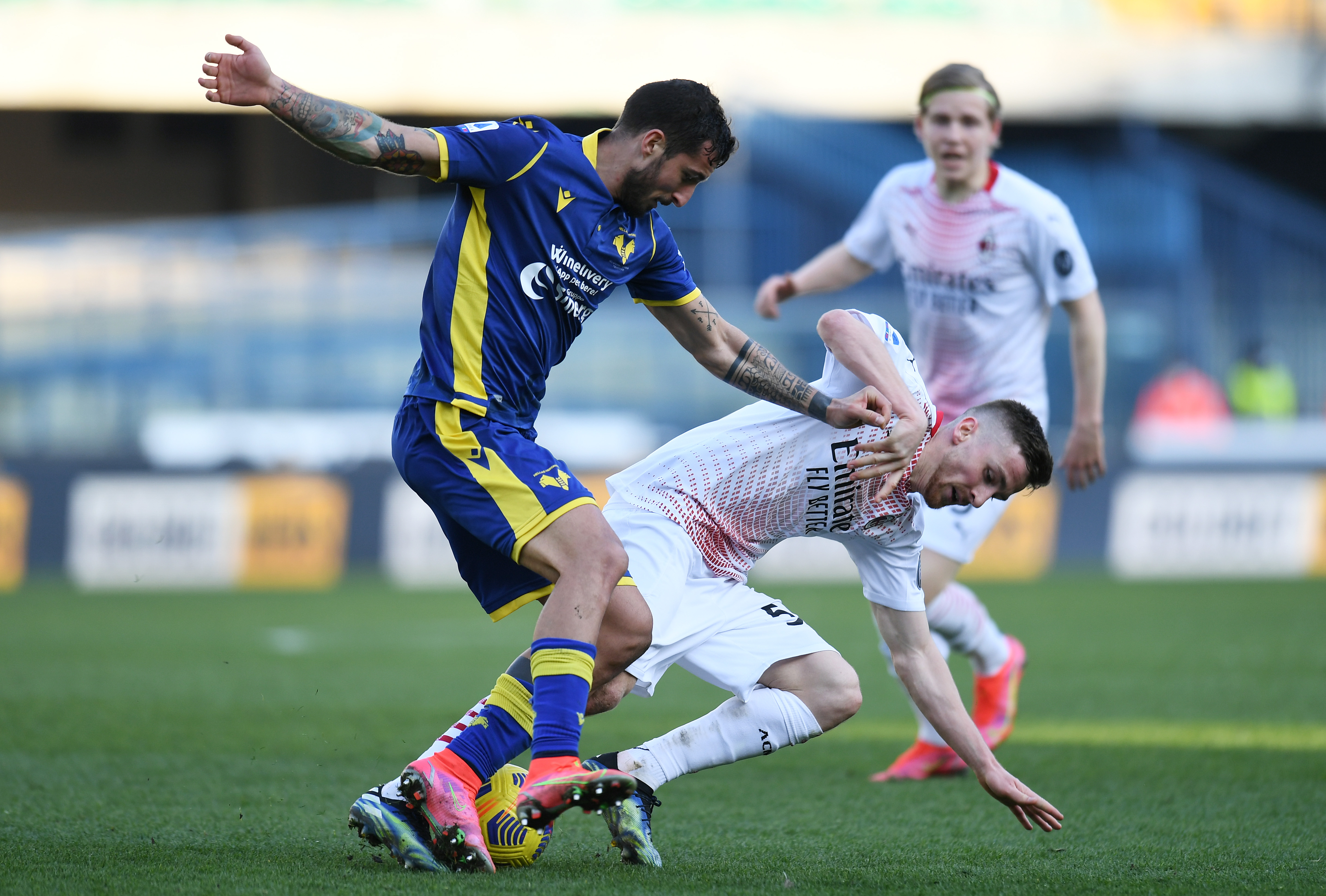 VERONA, ITALY - MARCH 07: Alexis Saelemaekers of A.C. Milan is challenged by Federico Ceccherini of Hellas Verona during the Serie A match between Hellas Verona FC and AC Milan at Stadio Marcantonio Bentegodi on March 07, 2021 in Verona, Italy. Sporting stadiums around Italy remain under strict restrictions due to the Coronavirus Pandemic as Government social distancing laws prohibit fans inside venues resulting in games being played behind closed doors. (Photo by Alessandro Sabattini/Getty Images)