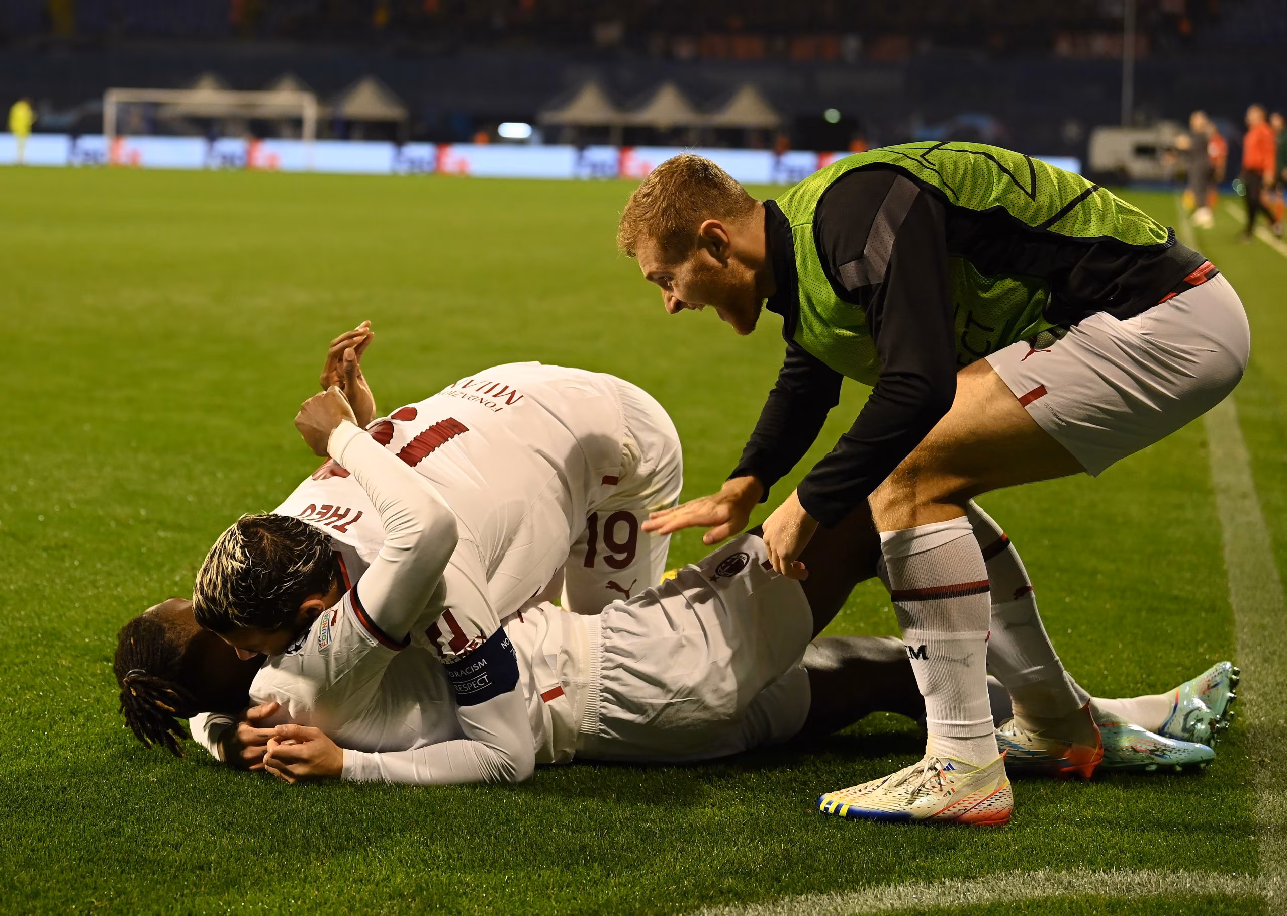 ZAGREB, CROATIA - OCTOBER 25: Rafael Leao of AC Milan celebrates with team-mates after scoring the second goal during the UEFA Champions League group E match between Dinamo Zagreb and AC Milan at Stadion Maksimir on October 25, 2022 in Zagreb, Croatia. (Photo by Claudio Villa/AC Milan via Getty Images)