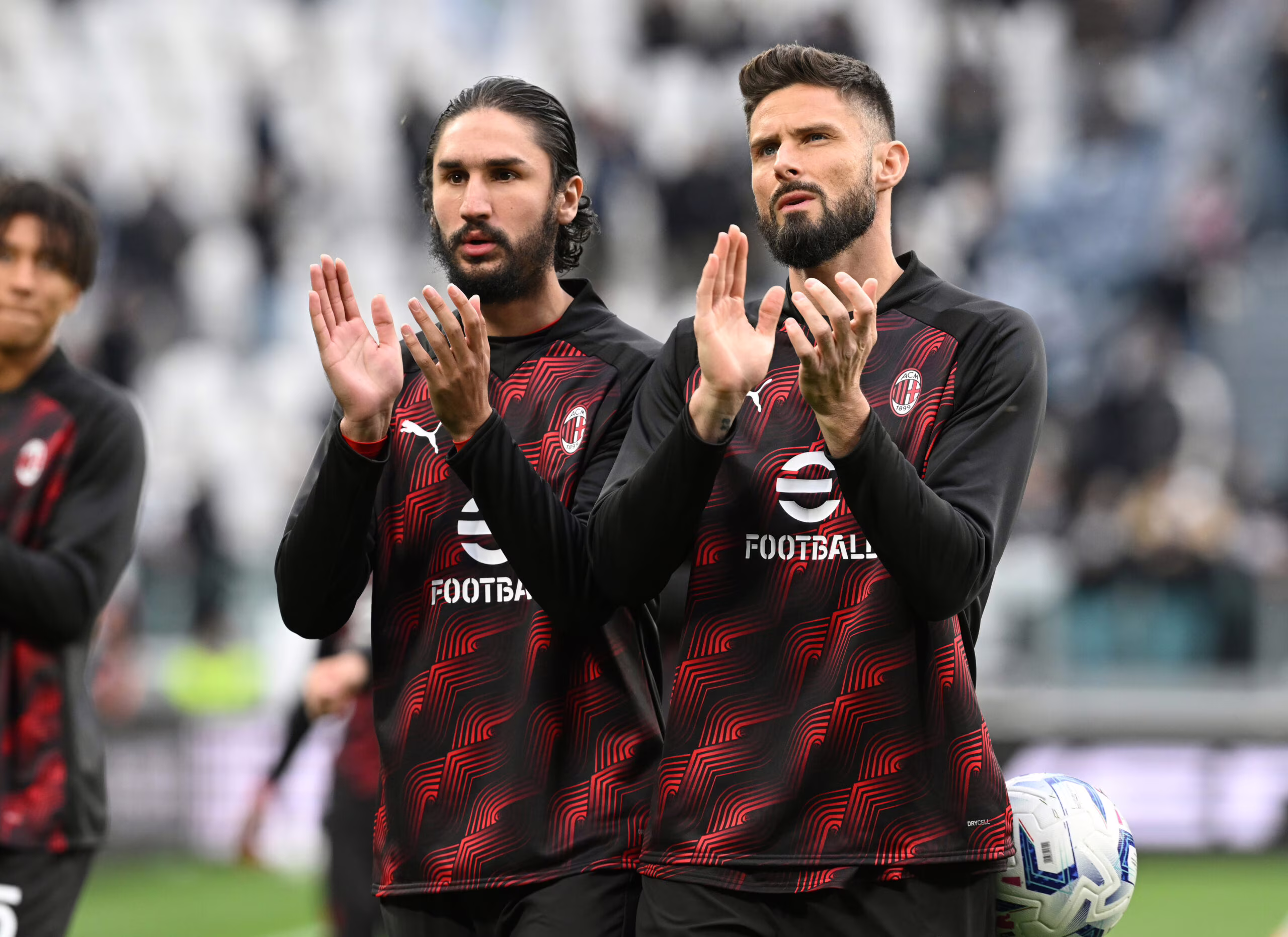TURIN, ITALY - APRIL 27: Olivier Giroud and Yacine Adli of AC Milan warms up ahea before the Serie A TIM match between Juventus and AC Milan at Allianz Stadium on April 27, 2024 in Turin, Italy. (Photo by Claudio Villa/AC Milan via Getty Images) (Photo by Claudio Villa/AC Milan via Getty Images)