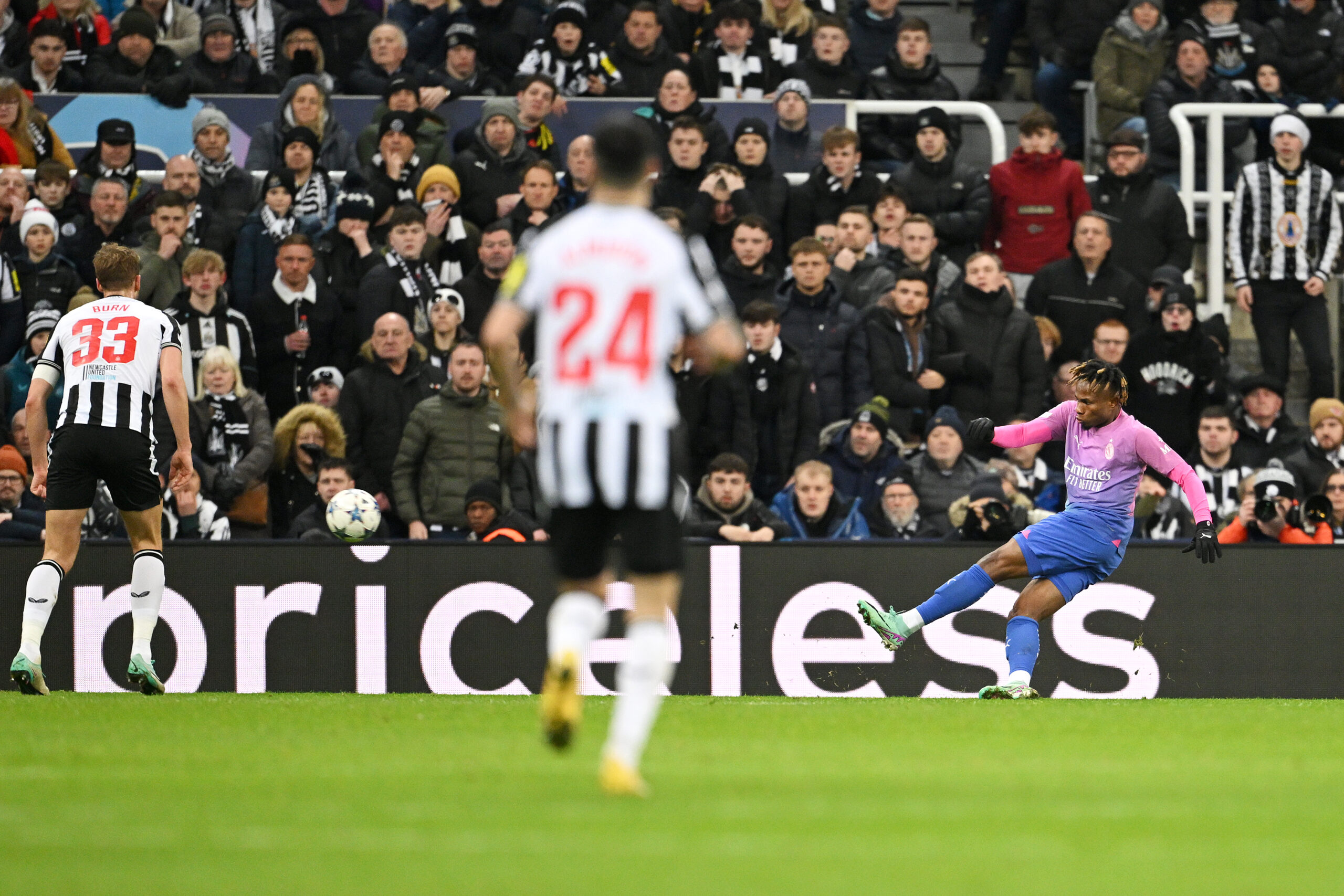 NEWCASTLE UPON TYNE, ENGLAND - DECEMBER 13: Samuel Chukwueze of AC Milan scores their team's second goal during the UEFA Champions League match between Newcastle United FC and AC Milan at St. James Park on December 13, 2023 in Newcastle upon Tyne, England. (Photo by Stu Forster/Getty Images)