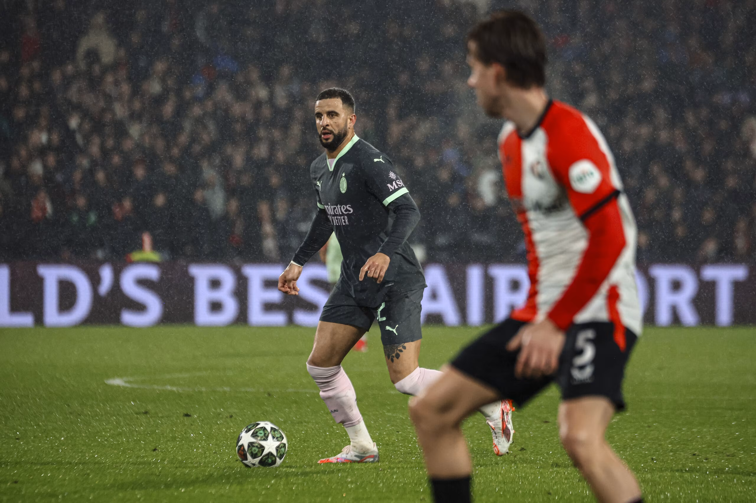 ROTTERDAM, NETHERLANDS - FEBRUARY 12: Kyle Walker of AC Milan in action during the UEFA Champions League 2024/25 League Knockout Play-off first leg match between Feyenoord and AC Milan at Stadion Feijenoord (De Kuip) on February 12, 2025 in Rotterdam, Netherlands. (Photo by Giuseppe Cottini/AC Milan via Getty Images)