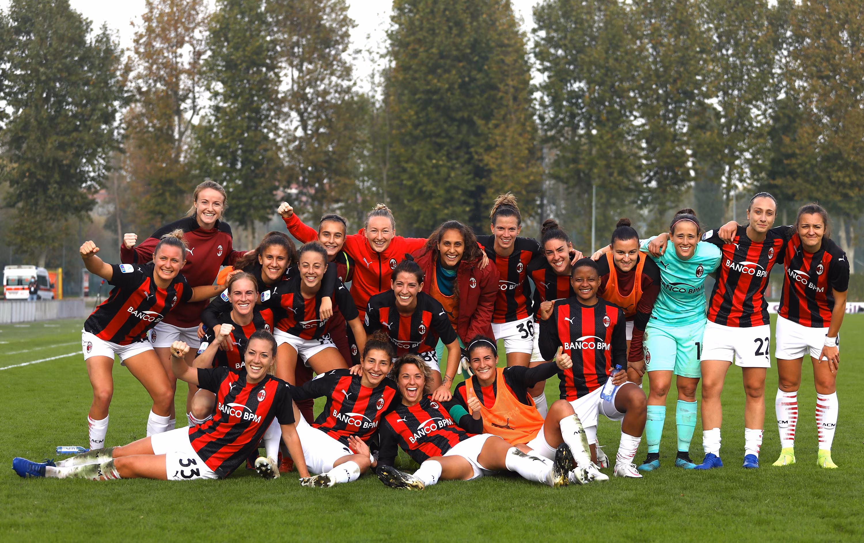 MILAN, ITALY - OCTOBER 18: The players of the AC Milan celebrate a victory at the end of the Women Serie A match between AC Milan and FC Internazionale at Centro Sportivo Vismara on October 18, 2020 in Milan, Italy. (Photo by Marco Luzzani/Getty Images)