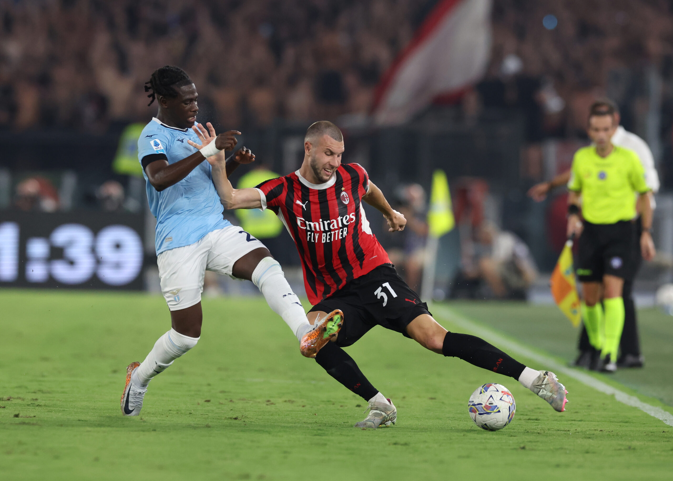 ROME, ITALY - AUGUST 31: Strahinja Pavlovic of AC Milan in action during the Serie match between Lazio and Milan at Stadio Olimpico on August 31, 2024 in Rome, Italy. (Photo by Claudio Villa/AC Milan via Getty Images)