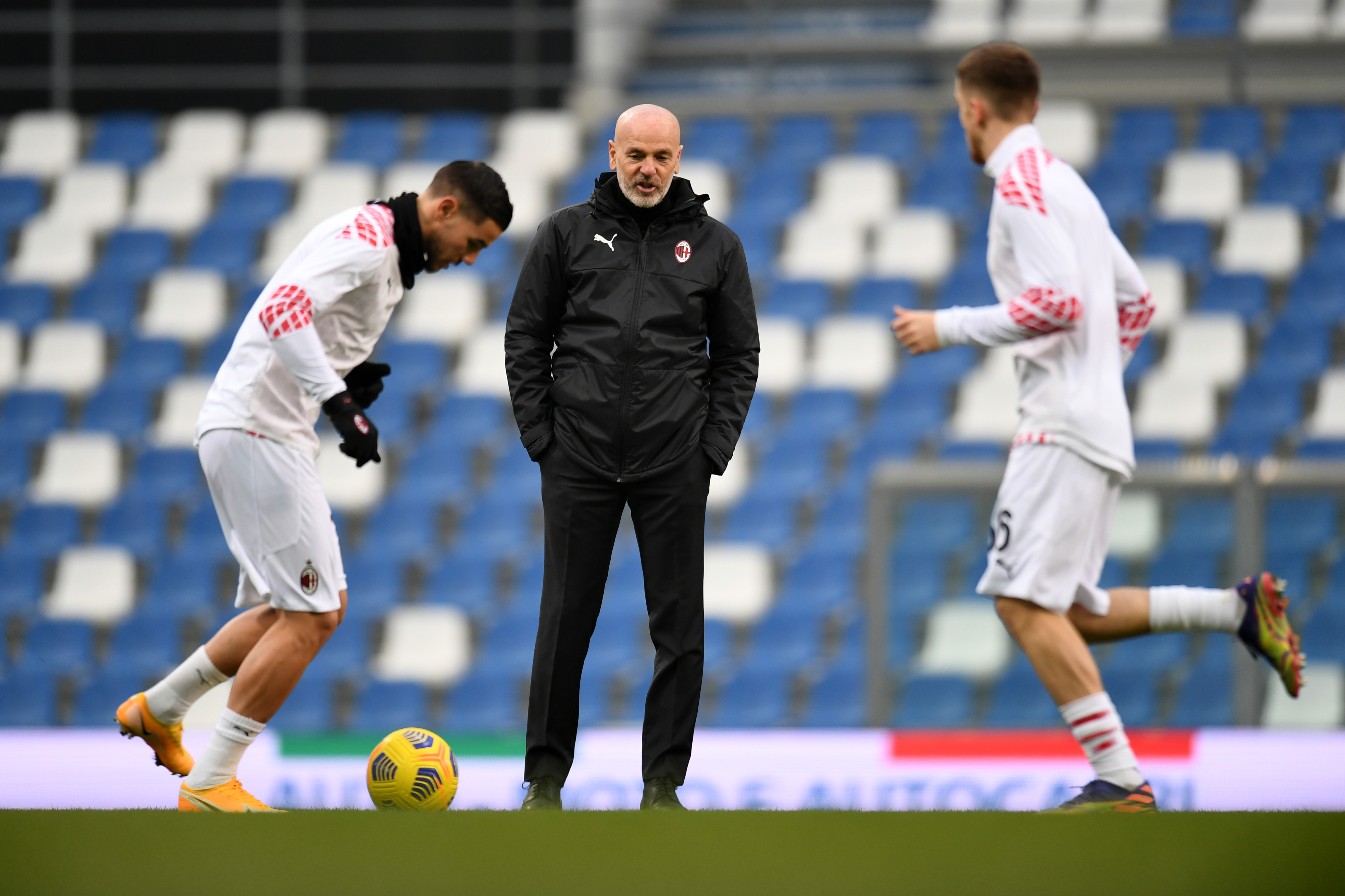 Pioli sorveglia l'allenamento di Theo Hernandez e di Saelemaekers.