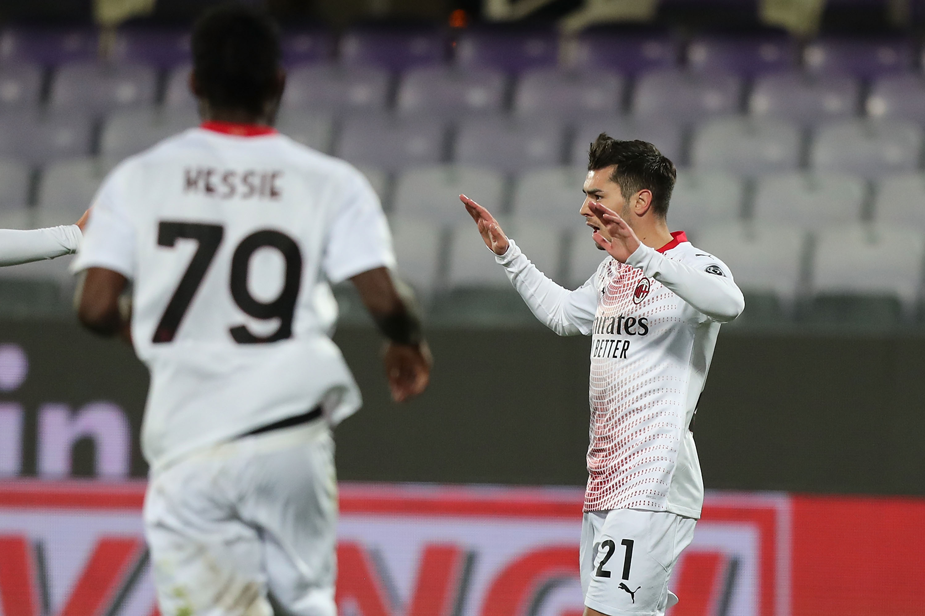 Brahim Diaz esulta dopo il goal alla Fiorentina; in primo piano Kessie