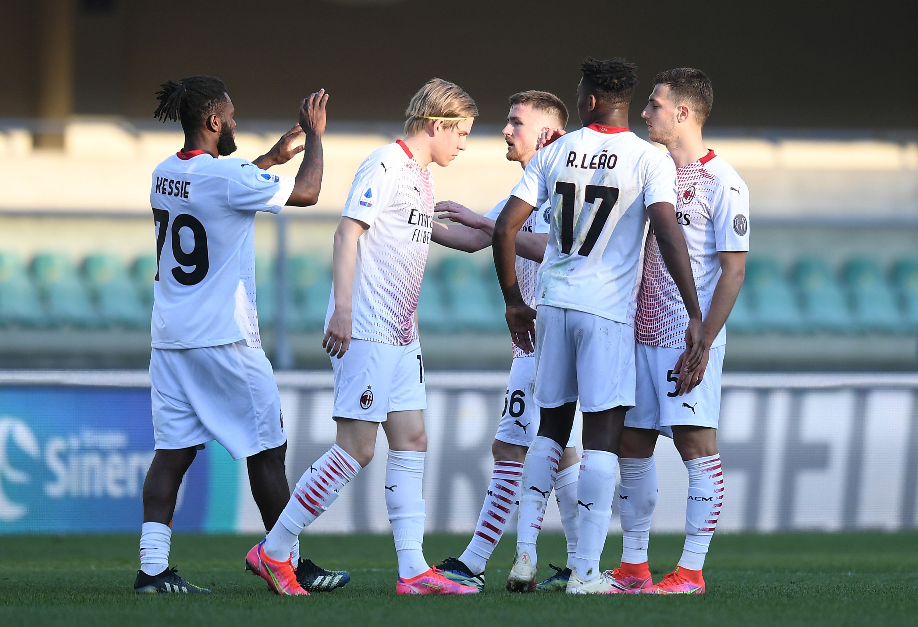 I calciatori del Milan esultano dopo un goal siglato nella sfida contro il Verona.