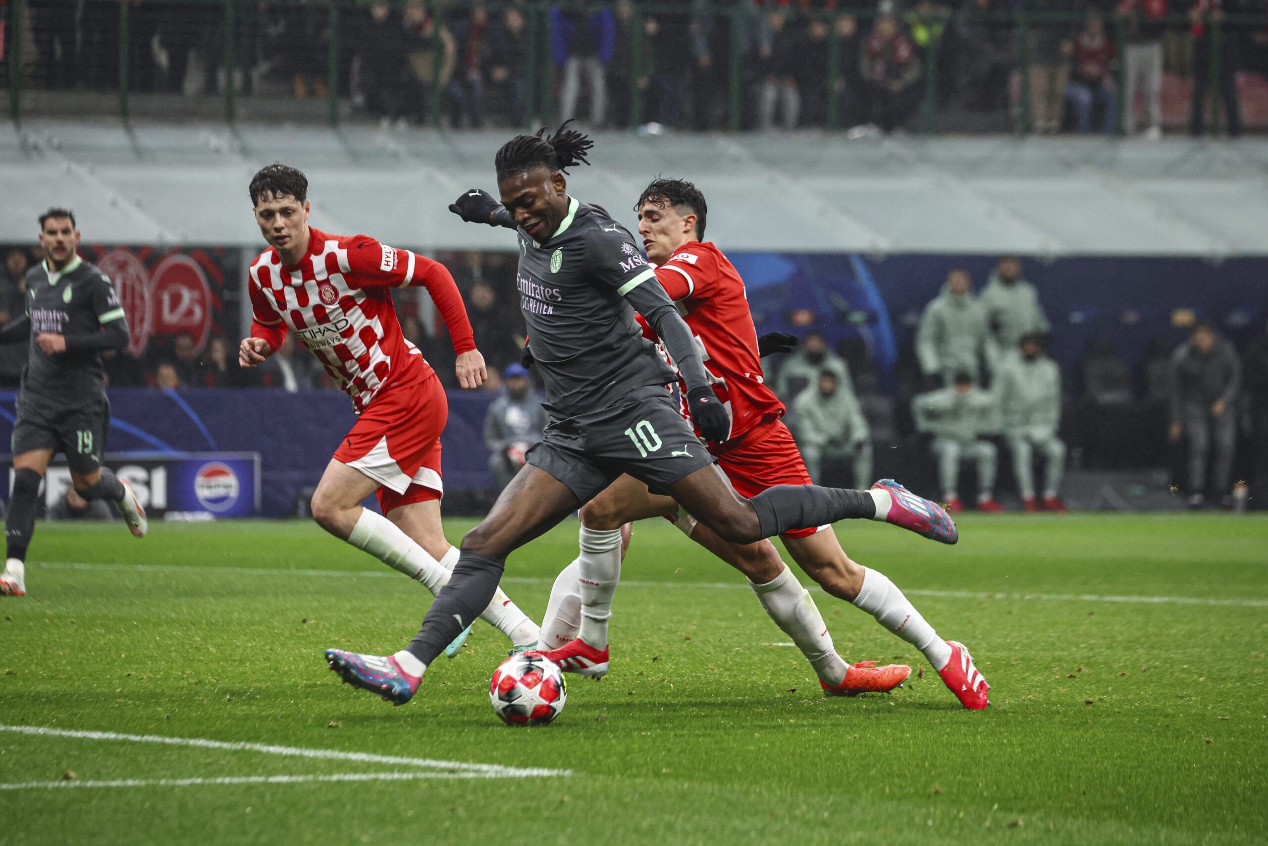 MILAN, ITALY - JANUARY 22: Rafael Leao of AC Milan scores the opening goal during the UEFA Champions League 2024/25 League Phase MD7 match between AC Milan and Girona FC at Stadio San Siro on January 22, 2025 in Milan, Italy. (Photo by Giuseppe Cottini/AC Milan via Getty Images)