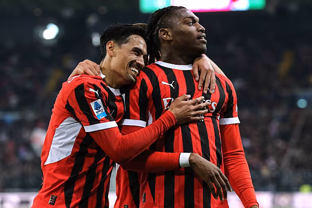 UDINE, ITALY - APRIL 11: Rafael Leao of Milan celebrates his goal during the Serie A match between Udinese and Milan at Stadio Friuli on April 11, 2025 in Udine, Italy. (Photo by Image Photo Agency/Getty Images)