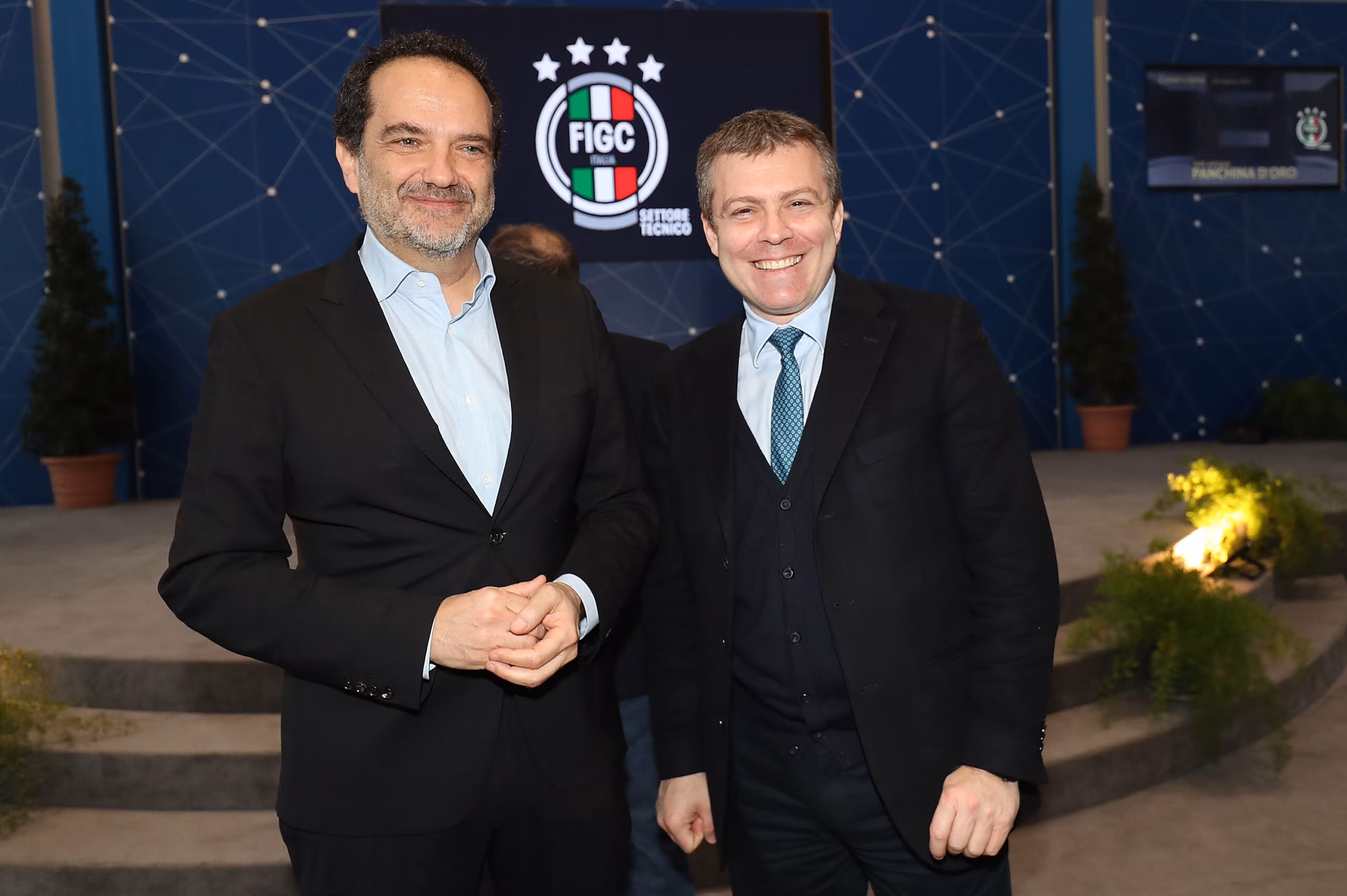 FLORENCE, ITALY - FEBRUARY 20: (L-R) Lega Pro President Matteo Marani and Lega Serie A President Lorenzo Casini are seen during the Italian Football Federation 'Panchina D'Oro' Awards Ceremony at Centro Tecnico Federale di Coverciano on February 20, 2023 in Florence, Italy. (Photo by Gabriele Maltinti/Getty Images)