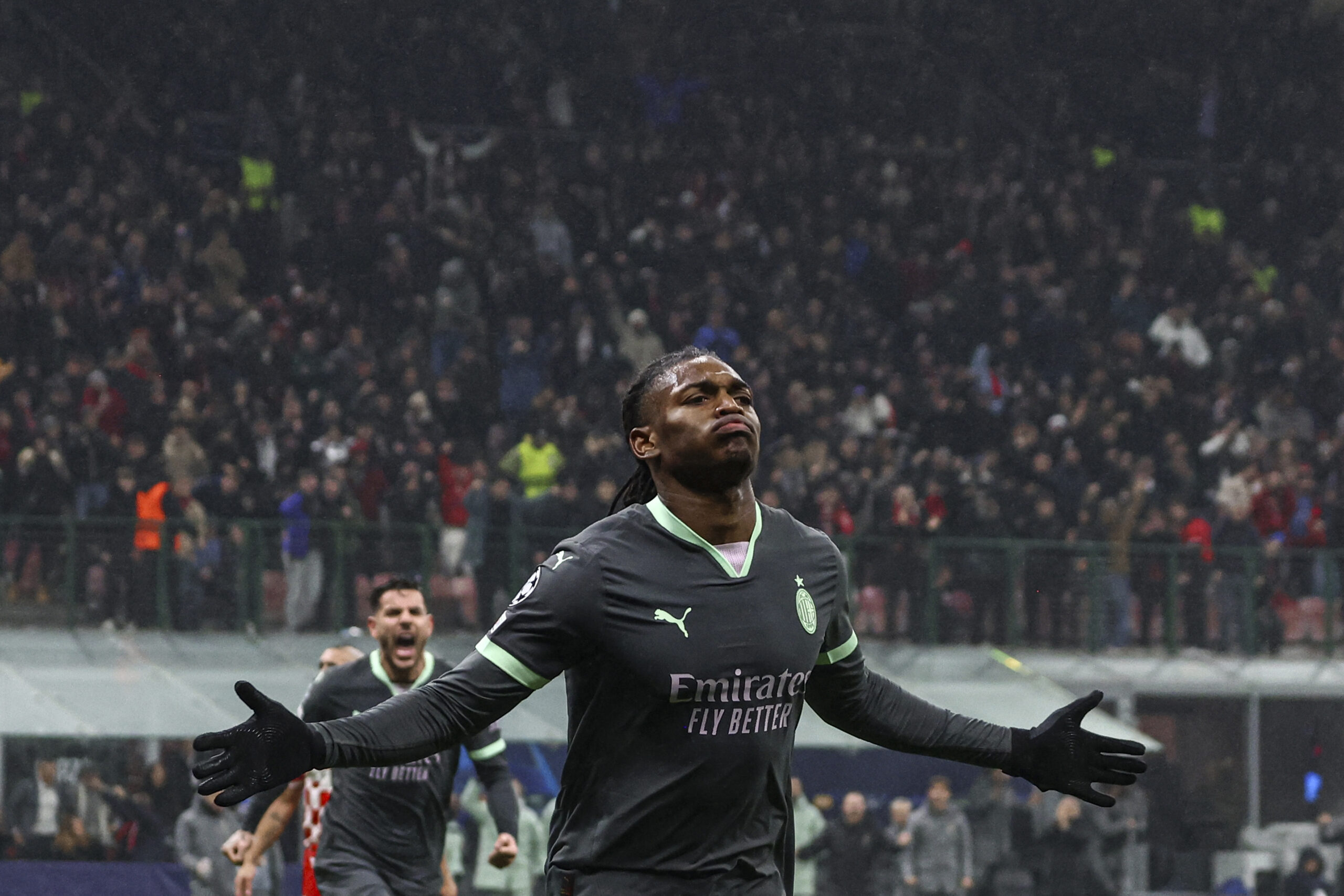 MILAN, ITALY - JANUARY 22: Rafael Leao of AC Milan celebrates after scoring the opening goal during the UEFA Champions League 2024/25 League Phase MD7 match between AC Milan and Girona FC at Stadio San Siro on January 22, 2025 in Milan, Italy. (Photo by Giuseppe Cottini/AC Milan via Getty Images)