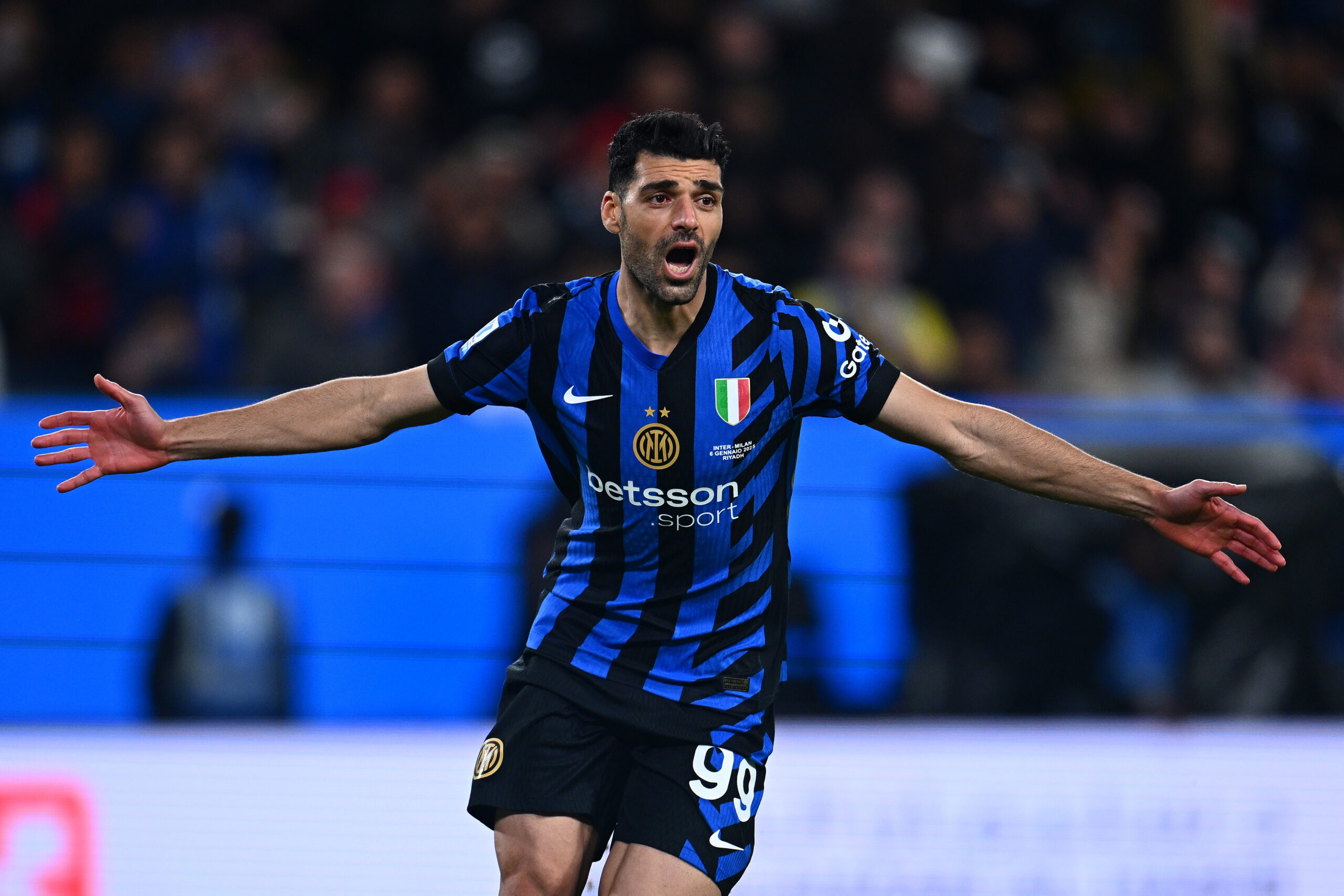 RIYADH, SAUDI ARABIA - JANUARY 06: Mehdi Taremi of FC Internazionale celebrates after scoring their team's second goal during the Italian Super Cup Final match between FC Internazionale and AC Milan at Al-Awwal Park Stadium on January 06, 2025 in Riyadh, Saudi Arabia. (Photo by Mattia Ozbot - Inter/Inter via Getty Images)