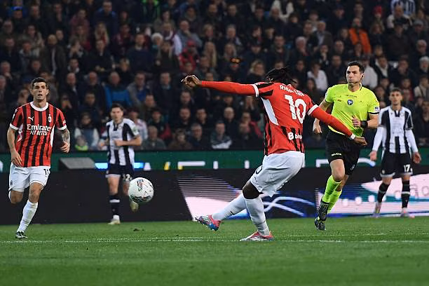 UDINE, ITALY - APRIL 11: Rafael Leao of AC Milan scores the opening goal during the Serie A match between Udinese and AC Milan at Stadio Friuli on April 11, 2025 in Udine, Italy. (Photo by Alessandro Sabattini/Getty Images)
