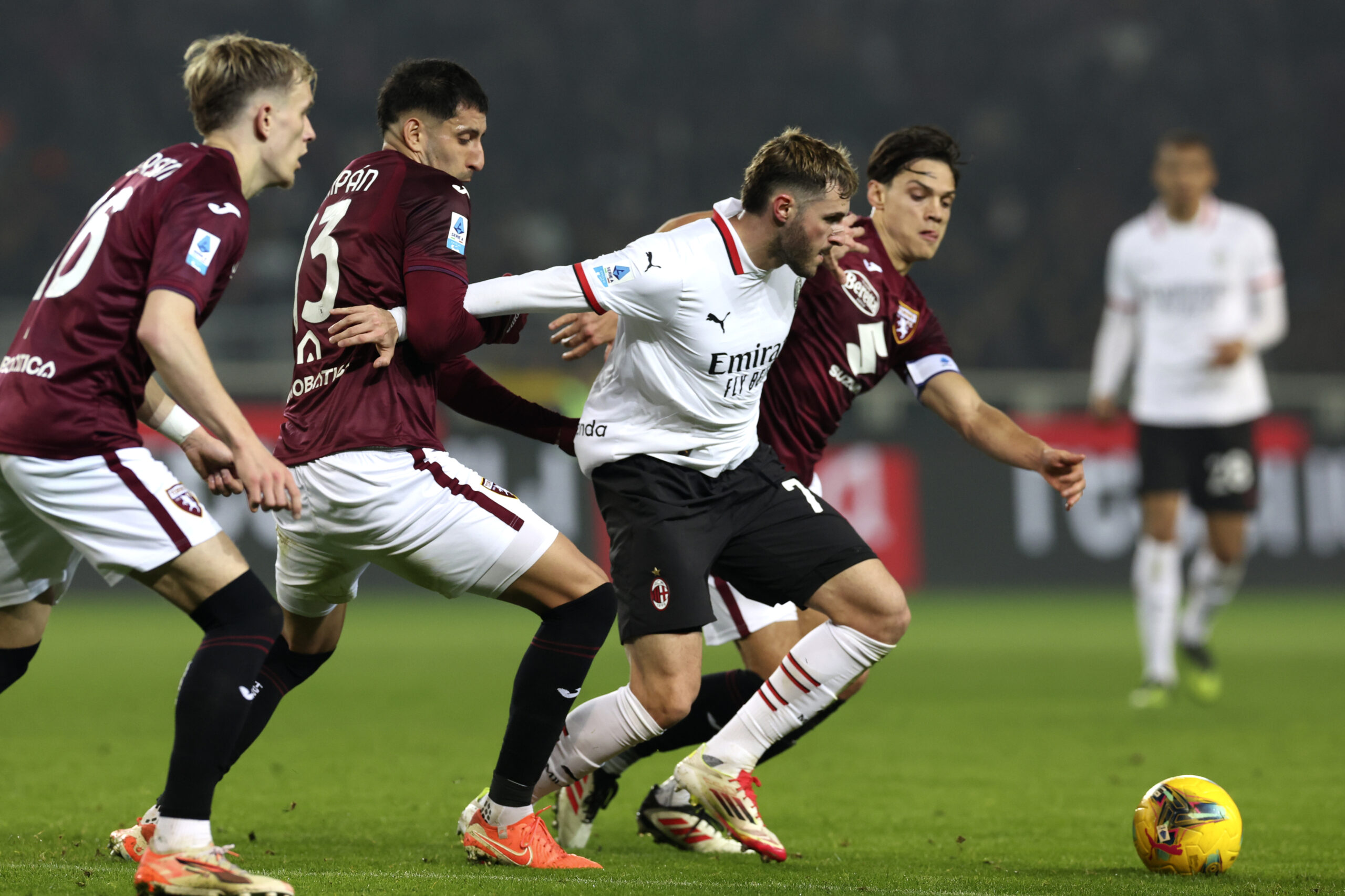 TURIN, ITALY - FEBRUARY 22: Samuele Ricci and Guillermo Maripan of Torino competes for the ball with Santiago Gimenez of AC Milan during the Serie A match between Torino and AC Milan at Stadio Olimpico di Torino on February 22, 2025 in Turin, Italy. (Photo by Claudio Villa/AC Milan via Getty Images)