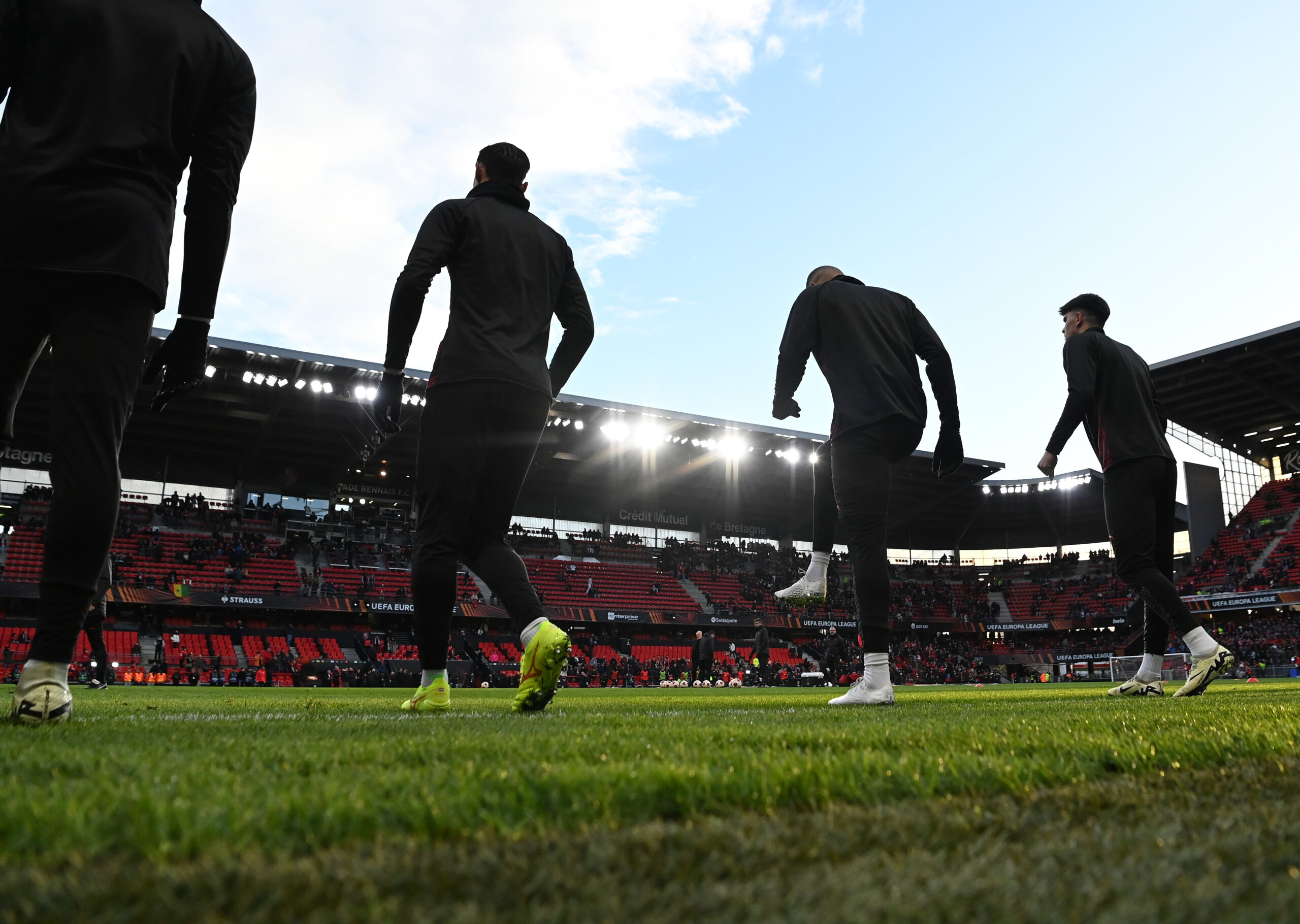 RENNES, FRANCE - FEBRUARY 22: Players of AC Milan warm up ahead before the UEFA Europa League 2023/24 playoff second leg match between Stade Rennais FC and AC Milan at Roazhon Park on February 22, 2024 in Rennes, France. (Photo by Claudio Villa/AC Milan via Getty Images)