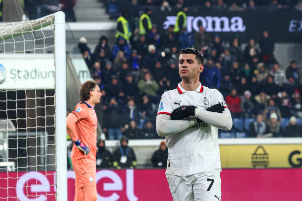 BERGAMO, ITALY - DECEMBER 06: Alvaro Morata of AC Milan celebrates after scoring the his team's first goal during the Serie A match between Atalanta and AC Milan at Gewiss Stadium on December 06, 2024 in Bergamo, Italy. (Photo by Giuseppe Cottini/Getty Images)