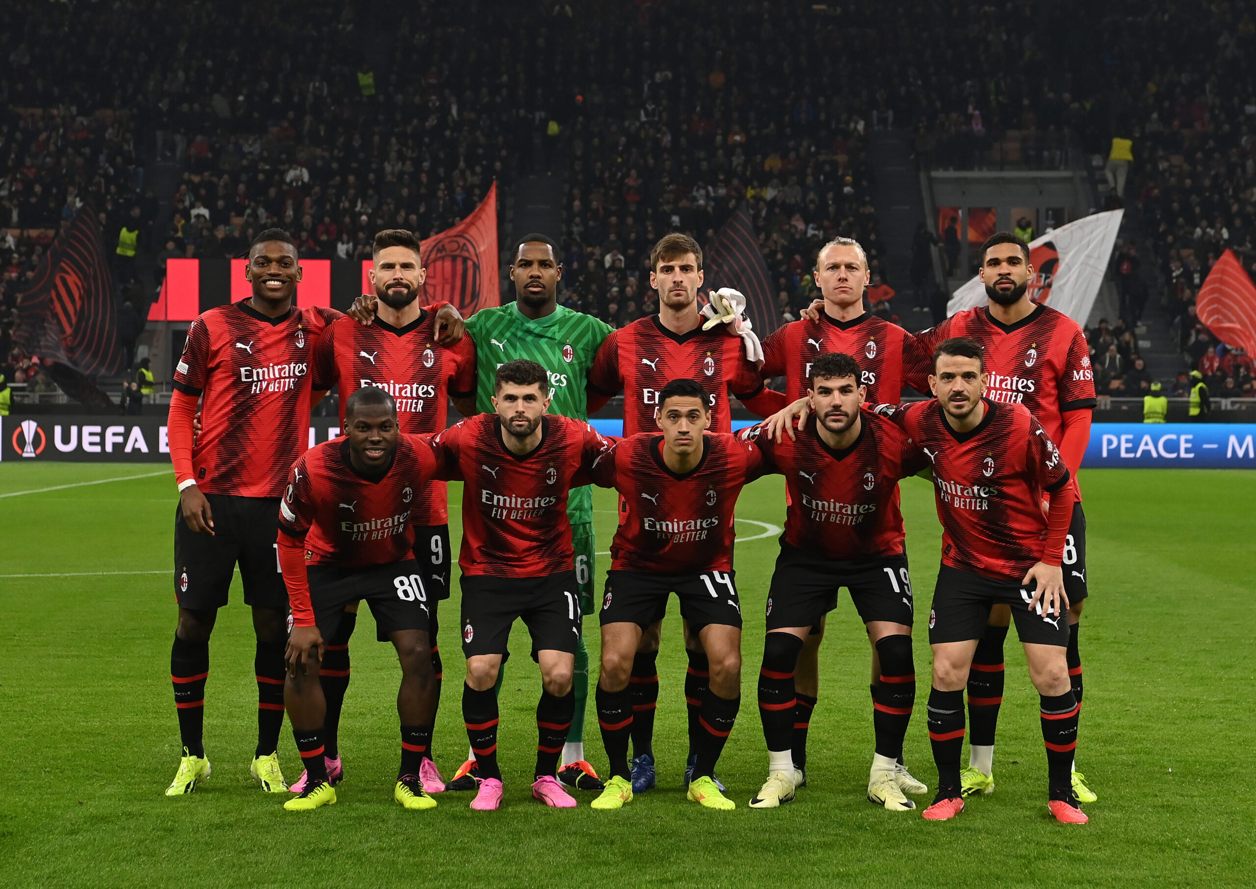 MILAN, ITALY - FEBRUARY 15: Players of AC Milan line up prior to the UEFA Europa League 2023/24 Playoff first leg match between AC Milan and Stade Rennais FC at Stadio Giuseppe Meazza on February 15, 2024 in Milan, Italy. (Photo by Claudio Villa/AC Milan via Getty Images)