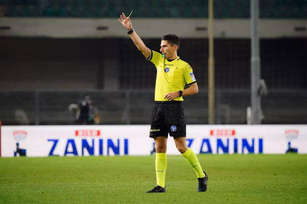 Federico Dionisi (Referee) shows the yellow card during the Italian championship Serie A football match between Hellas Verona FC and AC Monza at Stadio Marcantonio Bentegodi in Verona, Italy, on October 21, 2024. (Photo by Luca Rossini/NurPhoto via Getty Images)