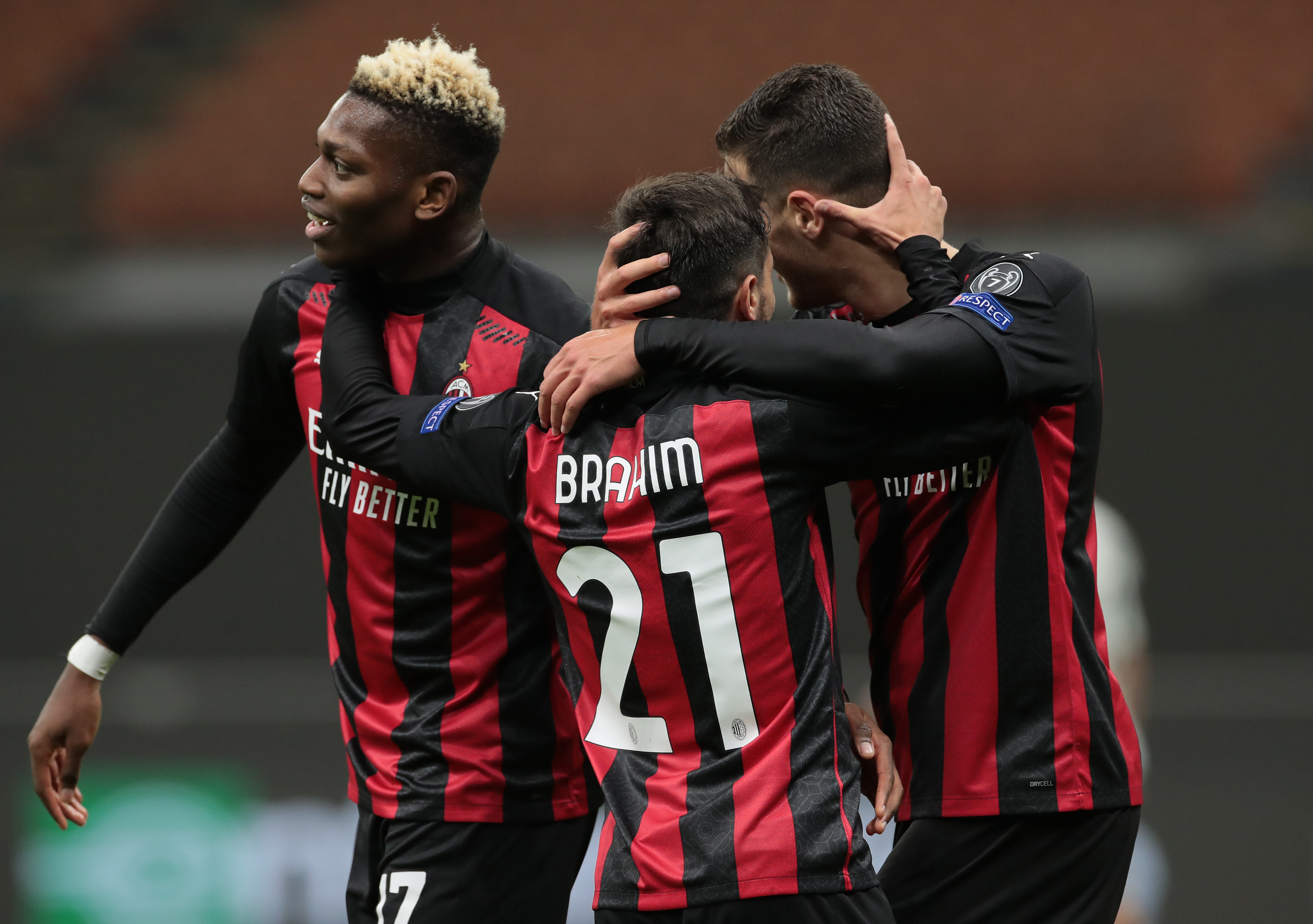 MILAN, ITALY - OCTOBER 29: Diogo Dalot (R) of AC Milan celebrates after scoring the third goal of his team with his team-mates Brahim Diaz and Rafael Leao during the UEFA Europa League Group H stage match between AC Milan and AC Sparta Praha at San Siro Stadium on October 29, 2020 in Milan, Italy. (Photo by Emilio Andreoli/Getty Images)