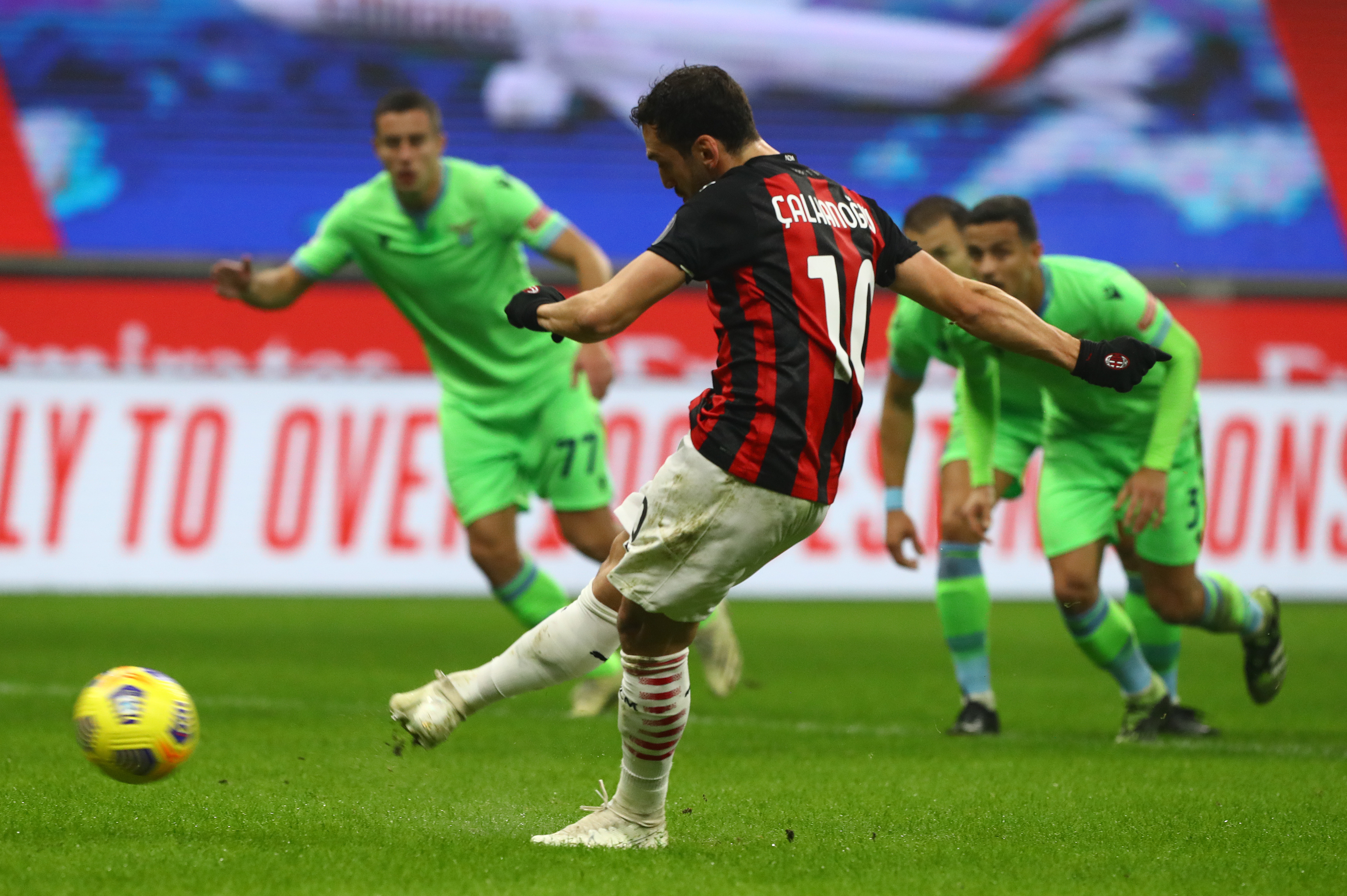 MILAN, ITALY - DECEMBER 23: Hakan Calhanoglu of AC Milan scores their sides second goal from the penalty spot during the Serie A match between AC Milan and SS Lazio at Stadio Giuseppe Meazza on December 23, 2020 in Milan, Italy. Sporting stadiums around Italy remain under strict restrictions due to the Coronavirus Pandemic as Government social distancing laws prohibit fans inside venues resulting in games being played behind closed doors. (Photo by Marco Luzzani/Getty Images)