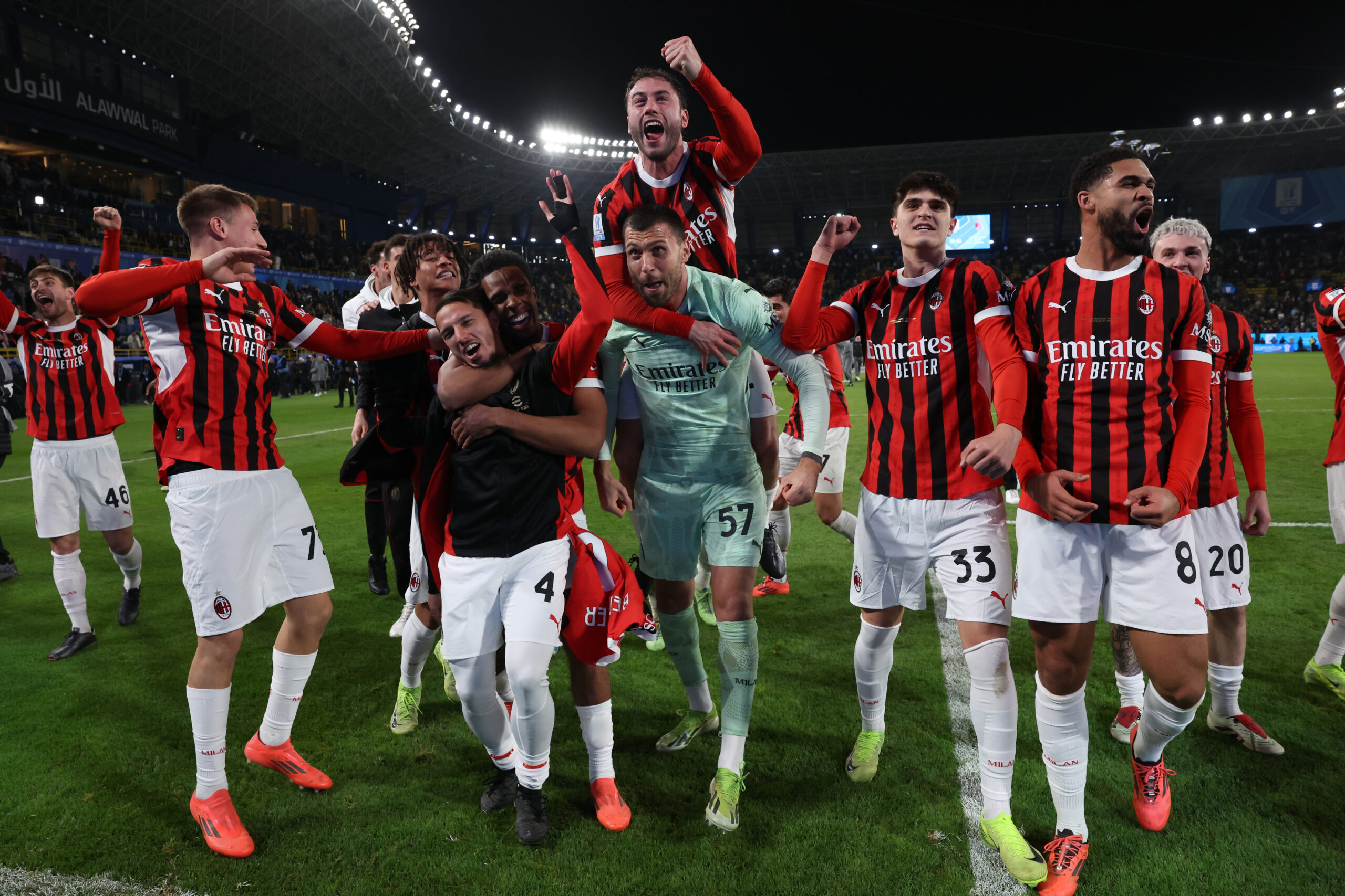 RIYADH, SAUDI ARABIA - JANUARY 06: Players of AC Milan celebrate after winning the Italian Super Cup Final match between FC Internazionale and AC Milan at Al- Awwal Park Stadium on January 06, 2025 in Riyadh, Saudi Arabia. (Photo by Claudio Villa/AC Milan via Getty Images)