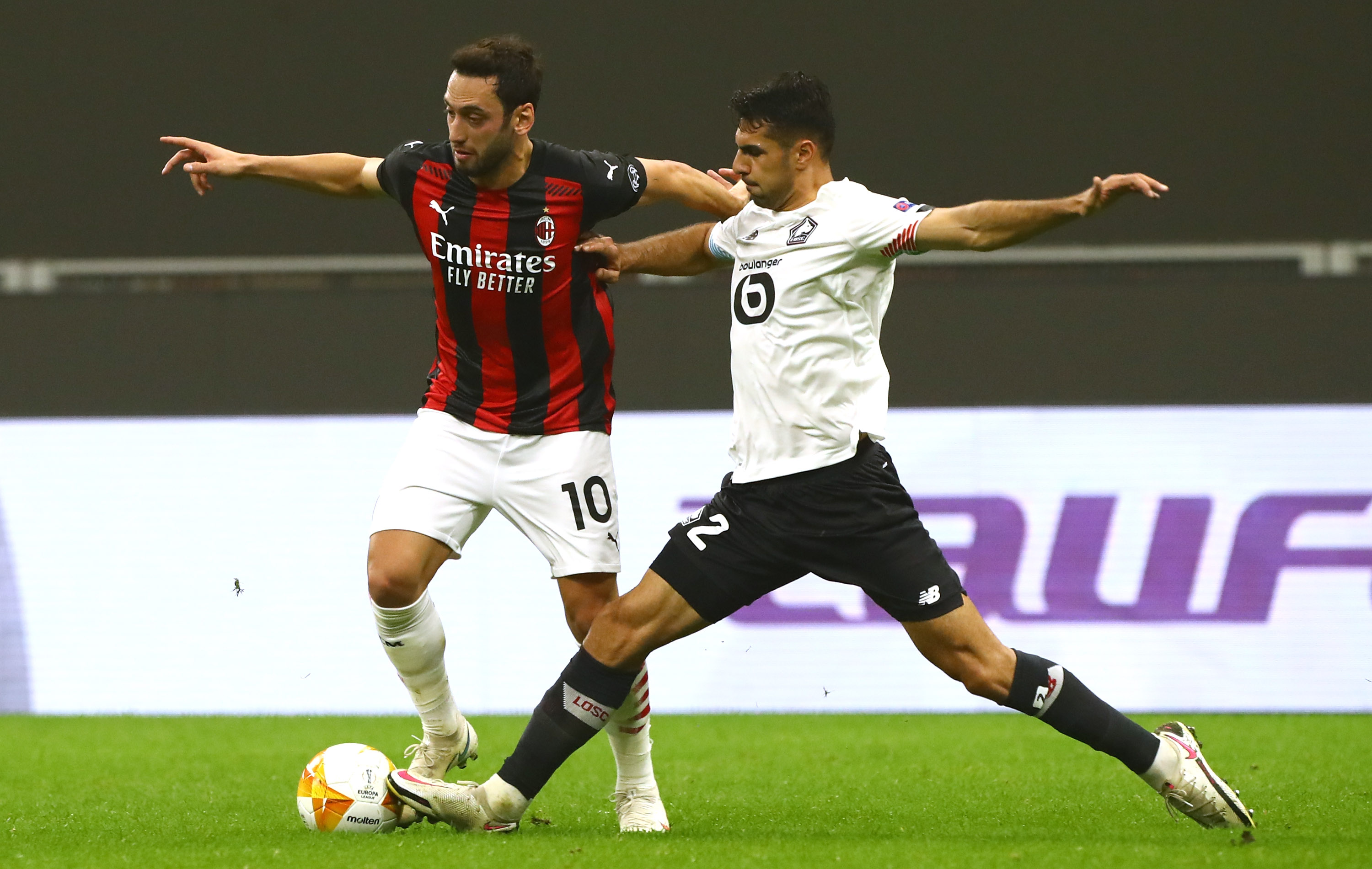 MILAN, ITALY - NOVEMBER 05: Hakan Calhanoglu of AC Milan competes for the ball with Zeki Celik of LOSC Lille during the UEFA Europa League Group H stage match between AC Milan and LOSC Lille at San Siro Stadium on November 5, 2020 in Milan, Italy. (Photo by Marco Luzzani/Getty Images)