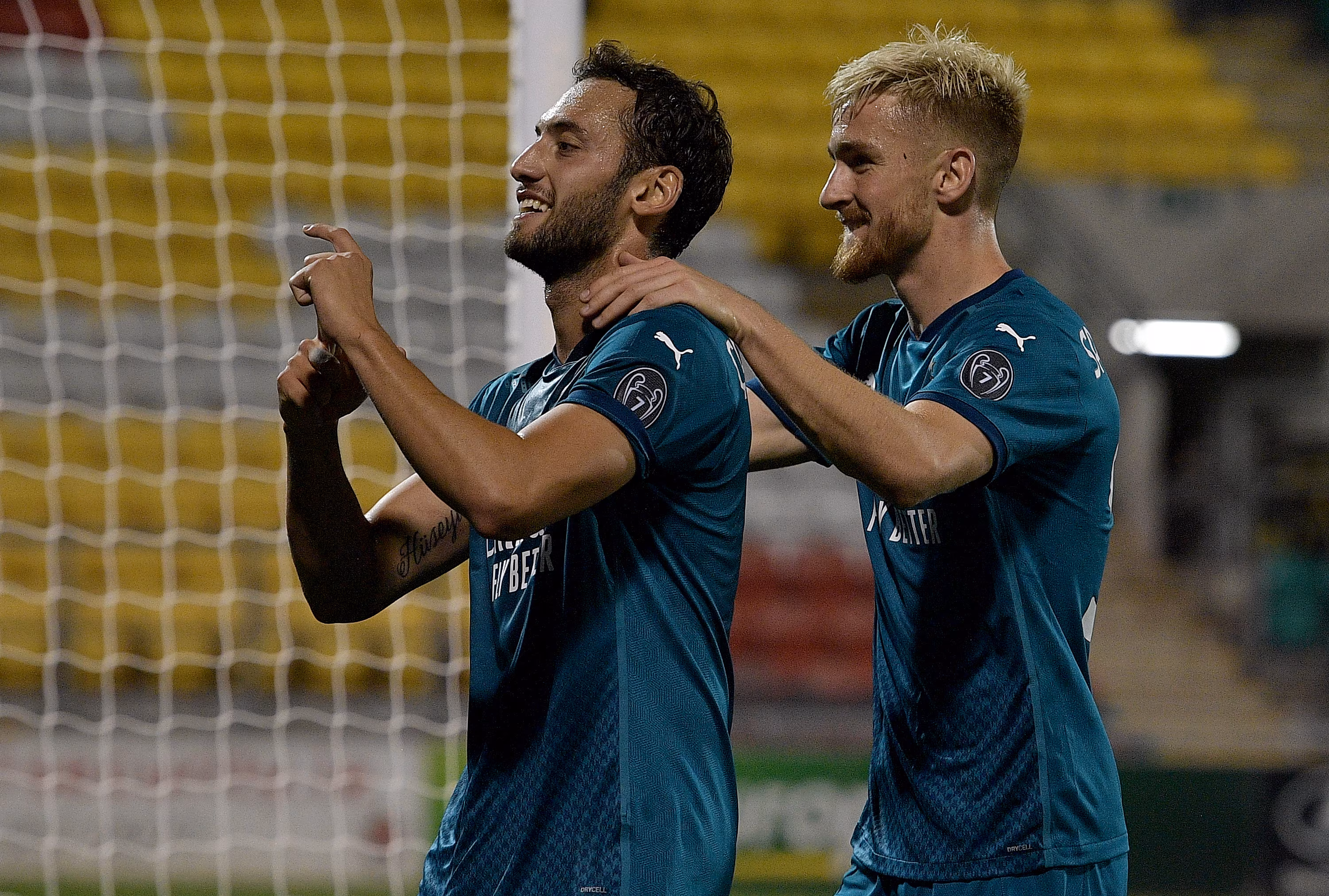 TALLAGHT, IRELAND - SEPTEMBER 17: Hakan Calhanoglu of AC Milan celebrates with teammates after scoring his team's second goal during the UEFA Europa League second qualifying round match between Shamrock Rovers and AC Milan at Tallaght Stadium on September 17, 2020 in Tallaght, Ireland. (Photo by Charles McQuillan/Getty Images)
