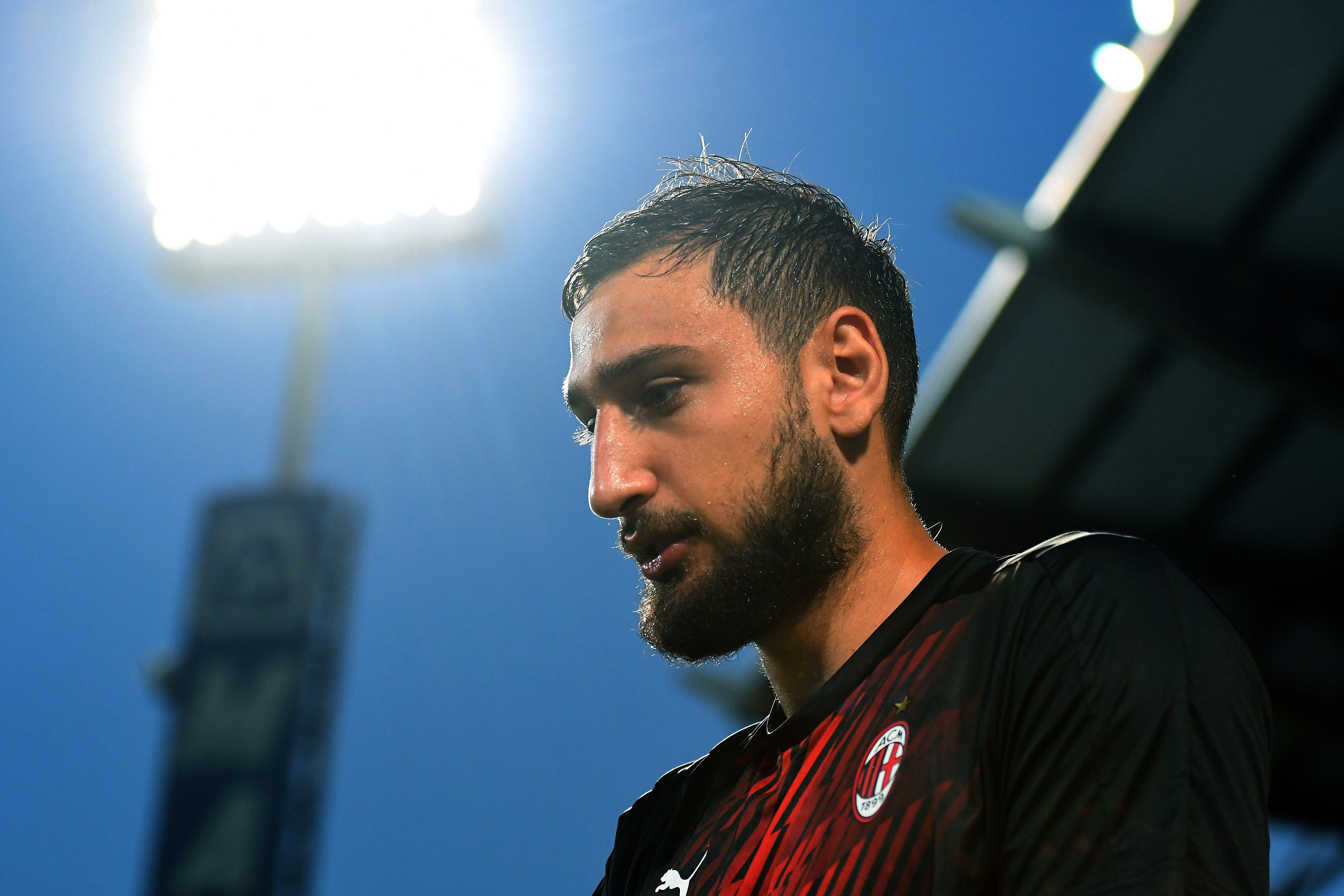 REGGIO NELL'EMILIA, ITALY - JULY 21: Gianluigi Donnarumma of AC Milan looks on during the Serie A match between US Sassuolo and AC Milan at Mapei Stadium - Città del Tricolore on July 21, 2020 in Reggio nell'Emilia, Italy. (Photo by Alessandro Sabattini/Getty Images)