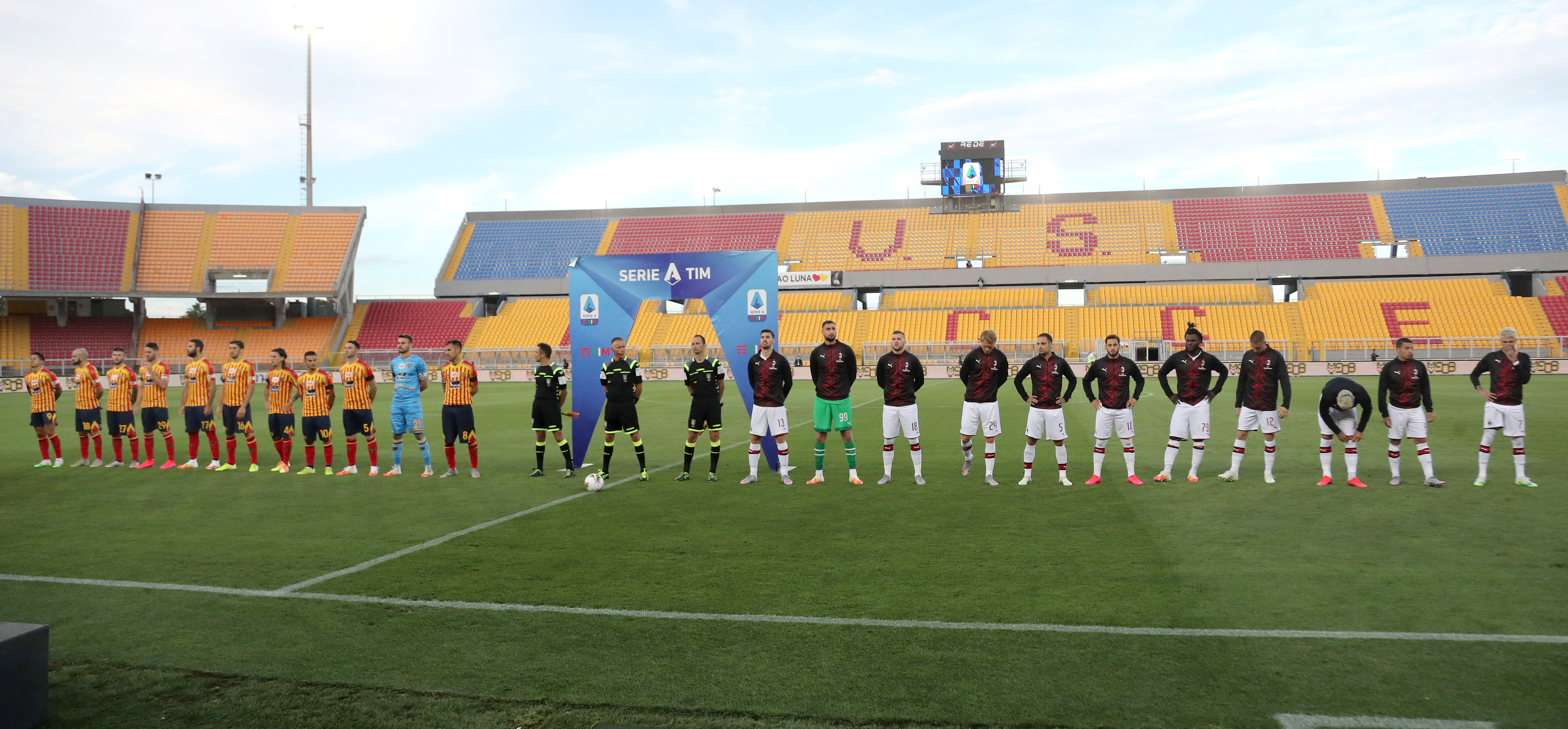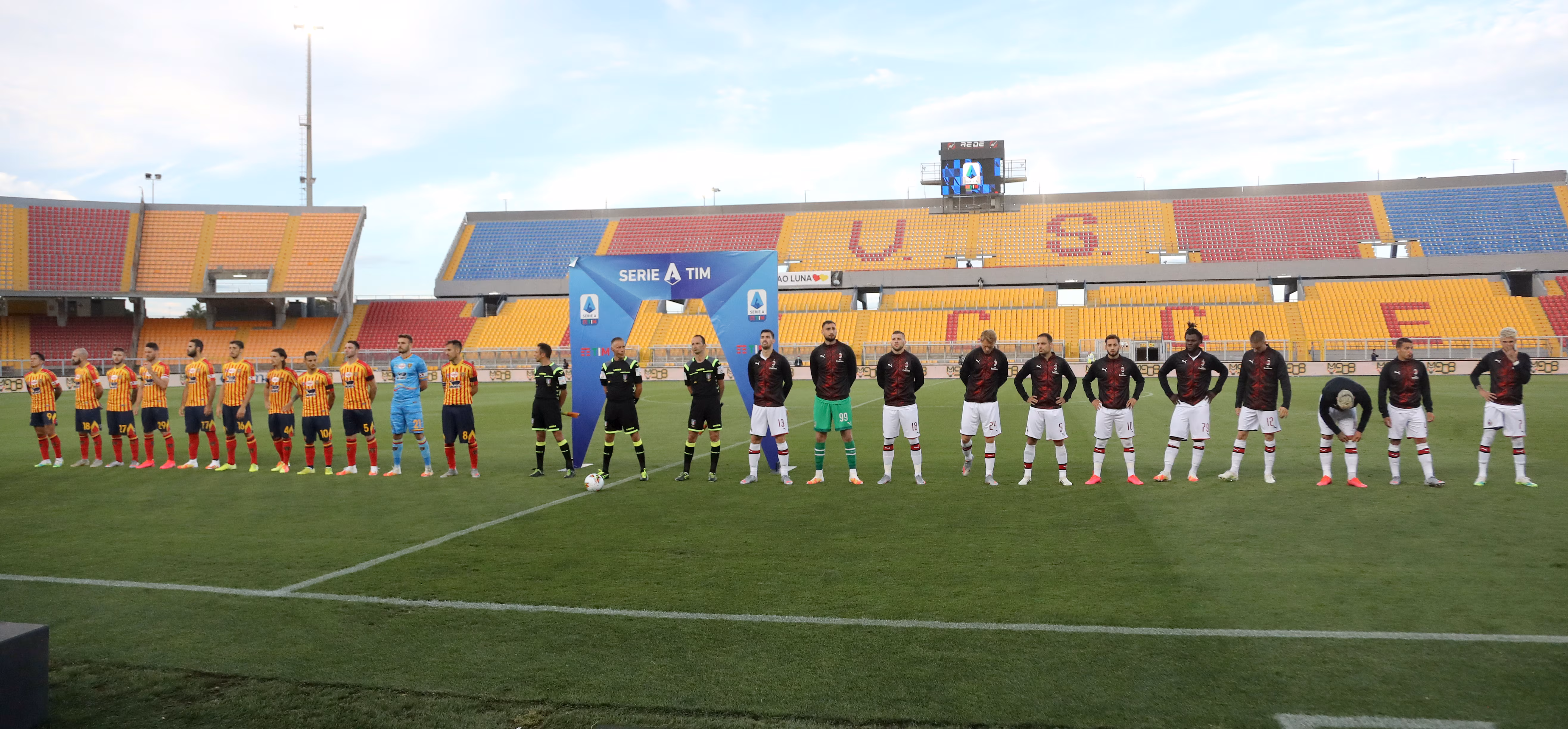 LECCE, ITALY - JUNE 22: Players of Lecce and Milan line-up during the Serie A match between US Lecce and AC Milan at Stadio Via del Mare on June 22, 2020 in Lecce, Italy. (Photo by Maurizio Lagana/Getty Images)
