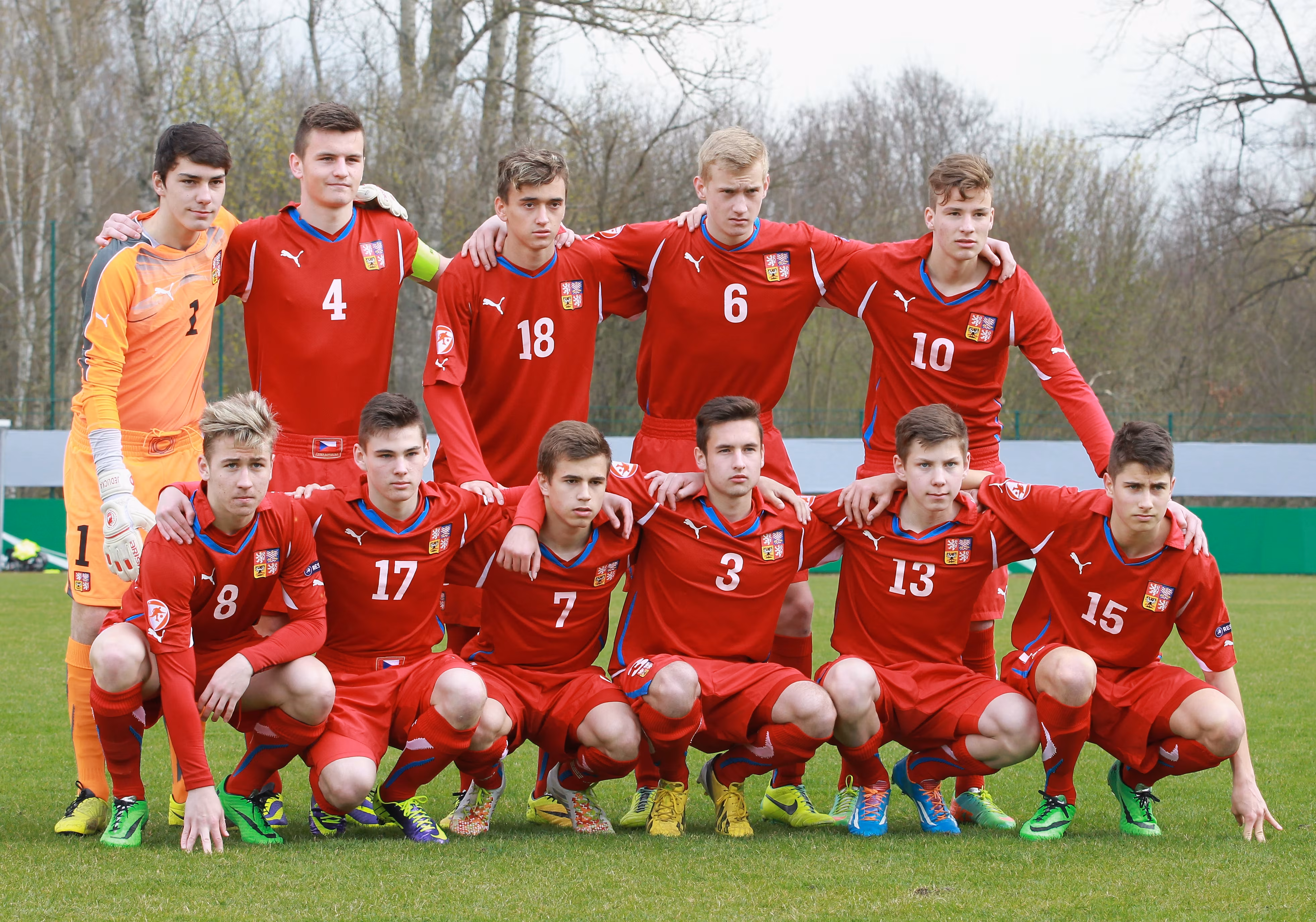 LEIPZIG, GERMANY - MARCH 25: The Czech Republic team pose, back row (L-R) Goalkeeper Martin Jedlicka, Marek Richter, Dominik Smekal, Daniel Koestl, Ondrej Sasinka, front row (L-R) Filip Havelka, Tomas Balvin, Martin Necas, Michal Blahusek, Daniel Marecek and Daniel Hlozek during the U16 international friendly match between Germany and Czech Republic at Stadion an der Kriekauer Strasse on March 25, 2014 in Taucha, Germany. (Photo by Karina Hessland/Bongarts/Getty Images)