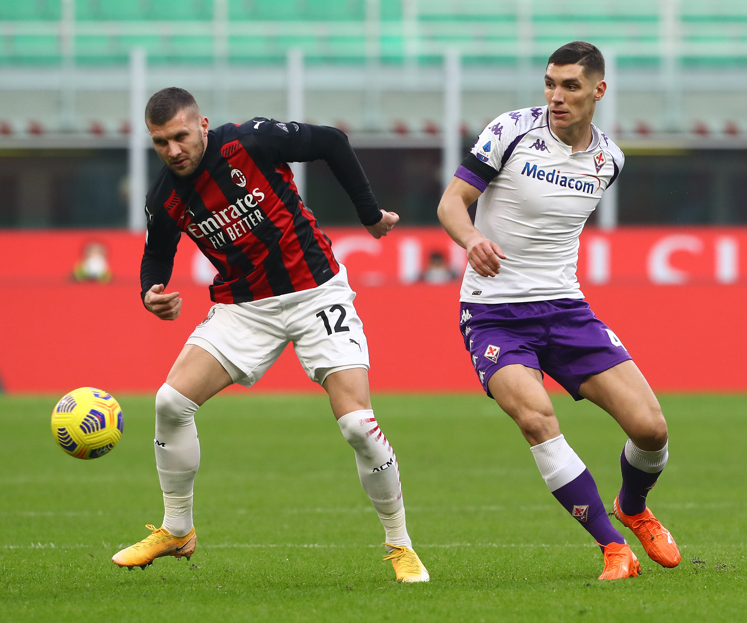 MILAN, ITALY - NOVEMBER 29: Ante Rebic of A.C. Milan is closed down by Nikola Milenkovic of ACF Fiorentina during the Serie A match between AC Milan and ACF Fiorentina at Stadio Giuseppe Meazza on November 29, 2020 in Milan, Italy. Sporting stadiums around Italy remain under strict restrictions due to the Coronavirus Pandemic as Government social distancing laws prohibit fans inside venues resulting in games being played behind closed doors. (Photo by Marco Luzzani/Getty Images)