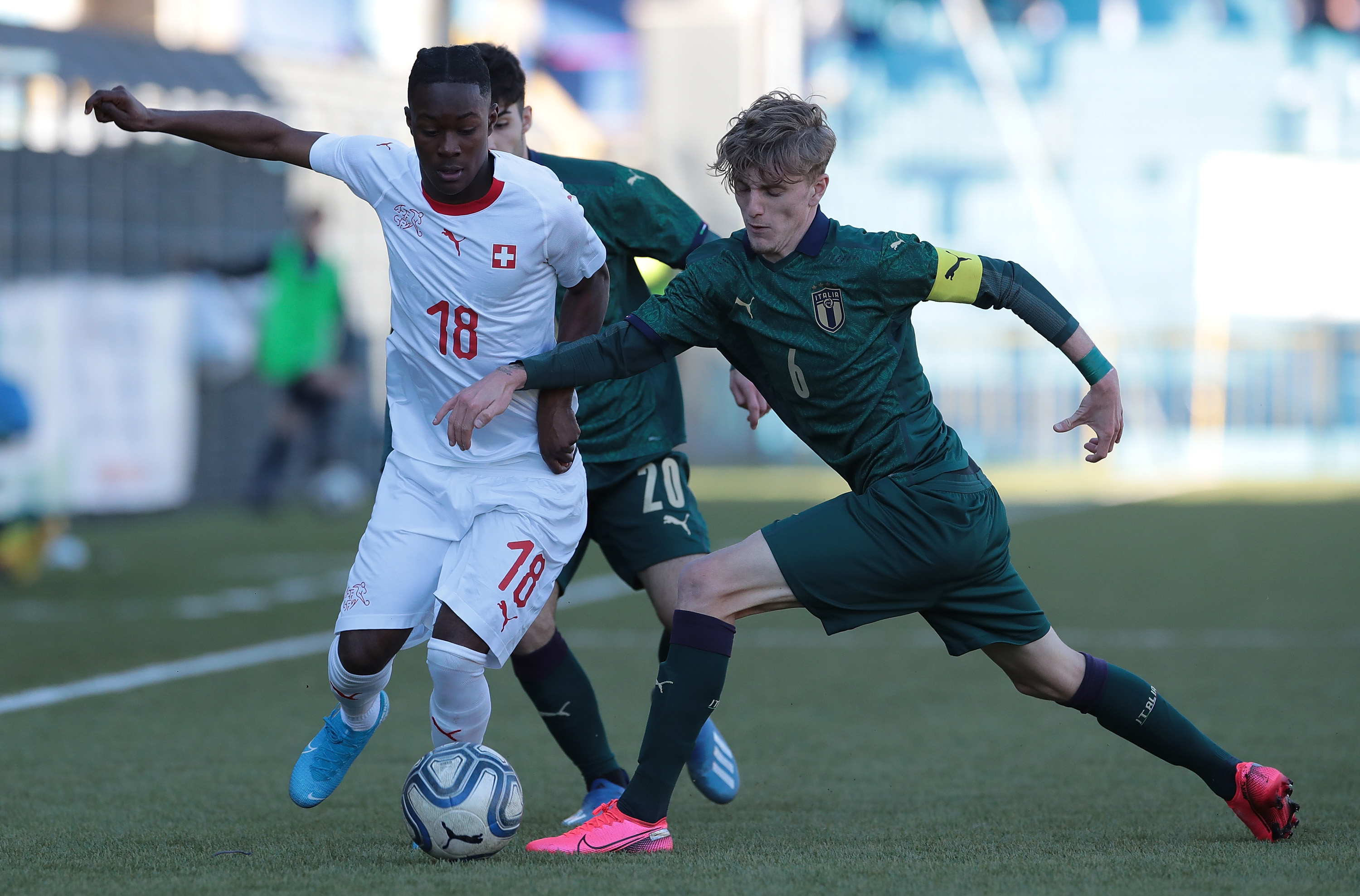 LECCO, ITALY - FEBRUARY 12: Felix Mambimbi of Switzerland is challenged by Nicolo Rovella of Italy during the International Friendly match between Italy U19 and Switzerland U19 at the Stadio Rigamonti-Ceppi on February 12, 2020 in Lecco, Italy. (Photo by Emilio Andreoli/Getty Images)