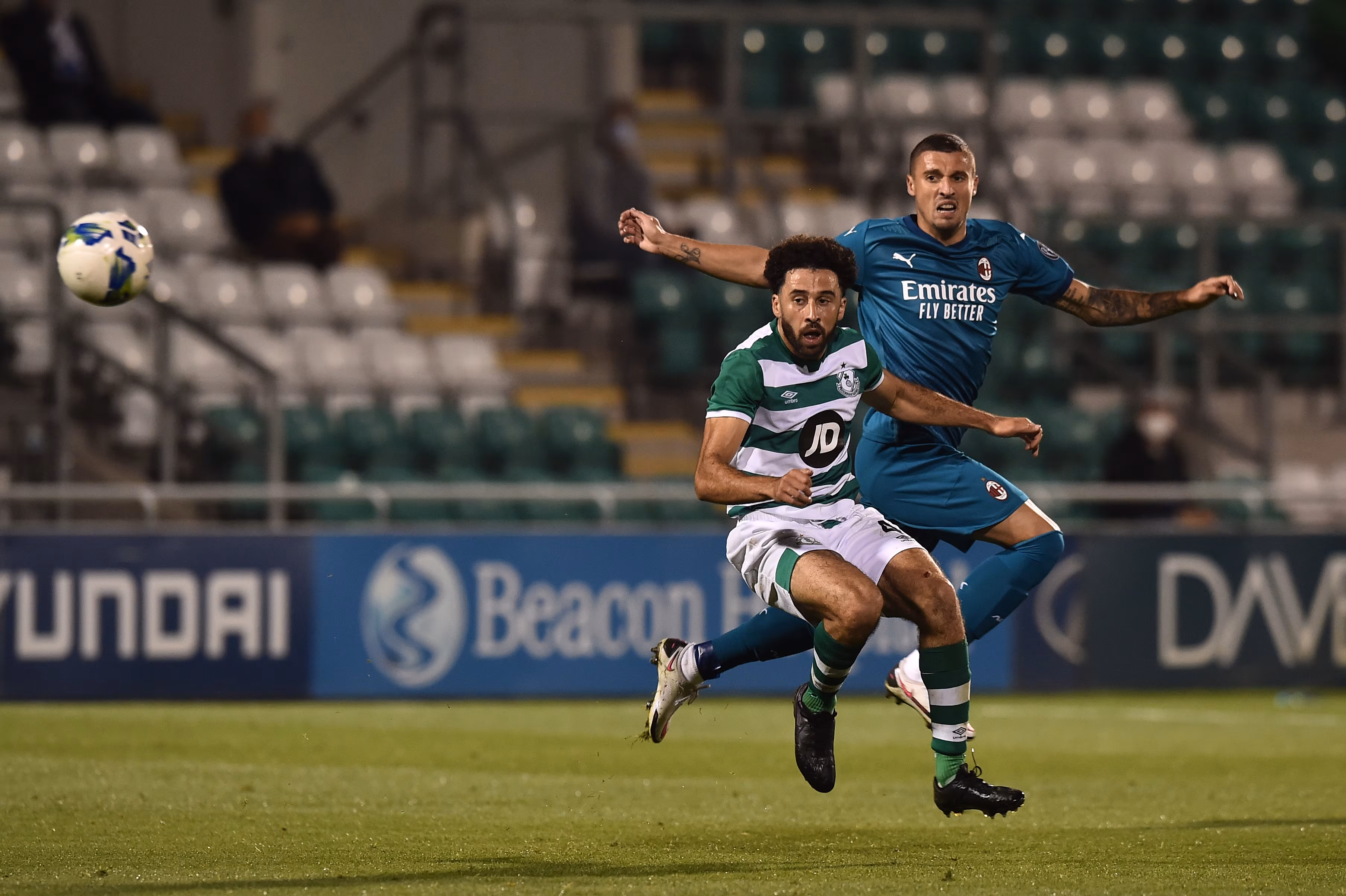 TALLAGHT, IRELAND - SEPTEMBER 17: Rade Krunic of AC Milan and Roberto Lopes of Shamrock Rovers in action during the UEFA Europa League second qualifying round match between Shamrock Rovers and AC Milan at Tallaght Stadium on September 17, 2020 in Tallaght, Ireland. (Photo by Charles McQuillan/Getty Images)