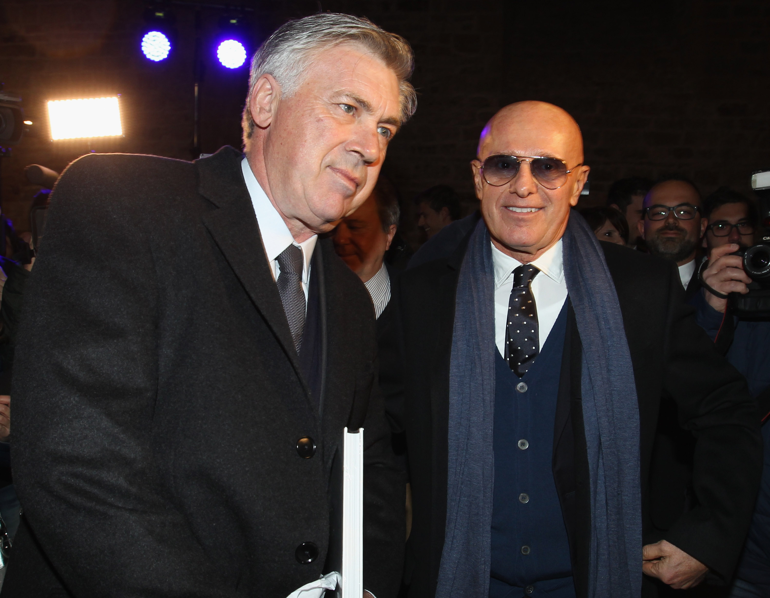 FLORENCE, ITALY - JANUARY 19: (L-R) Real Madrid head coach Carlo Ancelotti and Arrigo Sacchi attend the Italian Football Federation Hall of Fame Award ceremony at Palazzo Vecchio on January 19, 2015 in Florence, Italy. (Photo by Paolo Bruno/Getty Images)