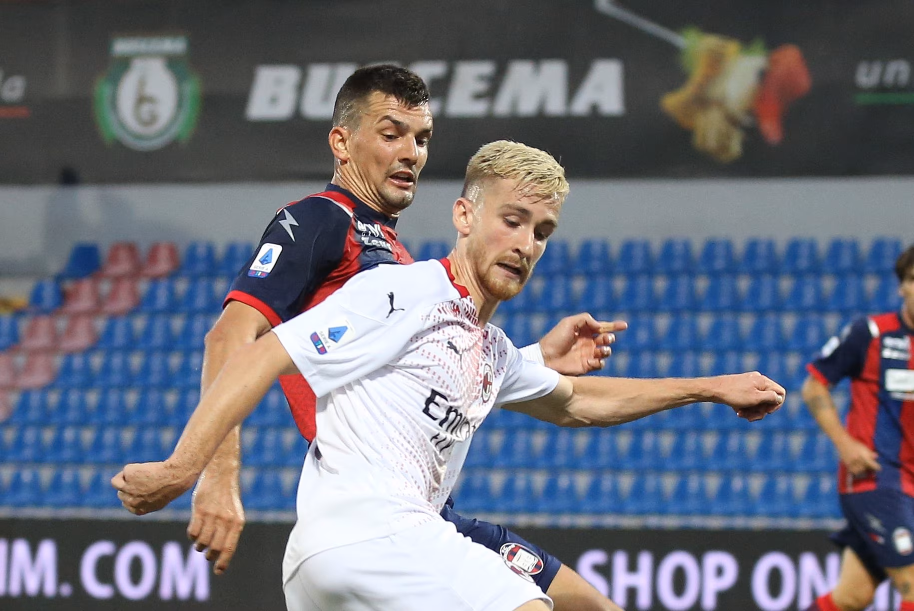 CROTONE, ITALY - SEPTEMBER 27: Lisandro Magallan of Crotone competes for the ball with Alexis Saelemaekers of Milan during the Serie A match between FC Crotone and AC Milan at Stadio Comunale Ezio Scida on September 27, 2020 in Crotone, Italy. (Photo by Maurizio Lagana/Getty Images)