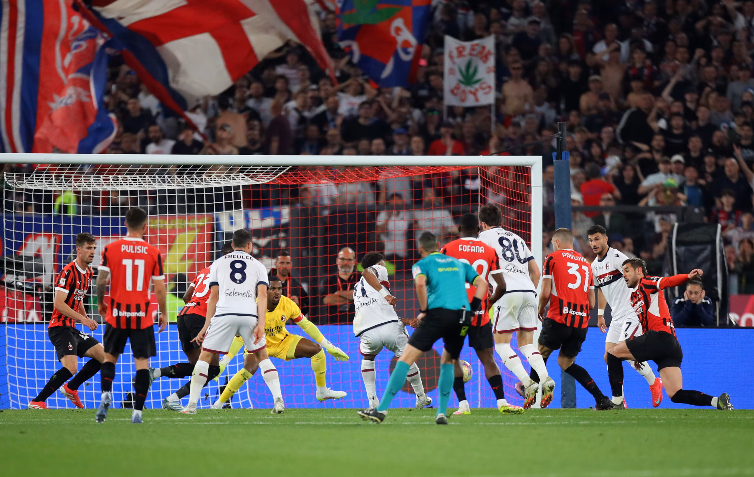 ROME, ITALY - MAY 14: Dan Ndoye of Bologna scores his team's first goal during the Coppa Italia Final match between AC Milan and Bologna at Stadio Olimpico on May 14, 2025 in Rome, Italy. (Photo by Paolo Bruno/Getty Images)