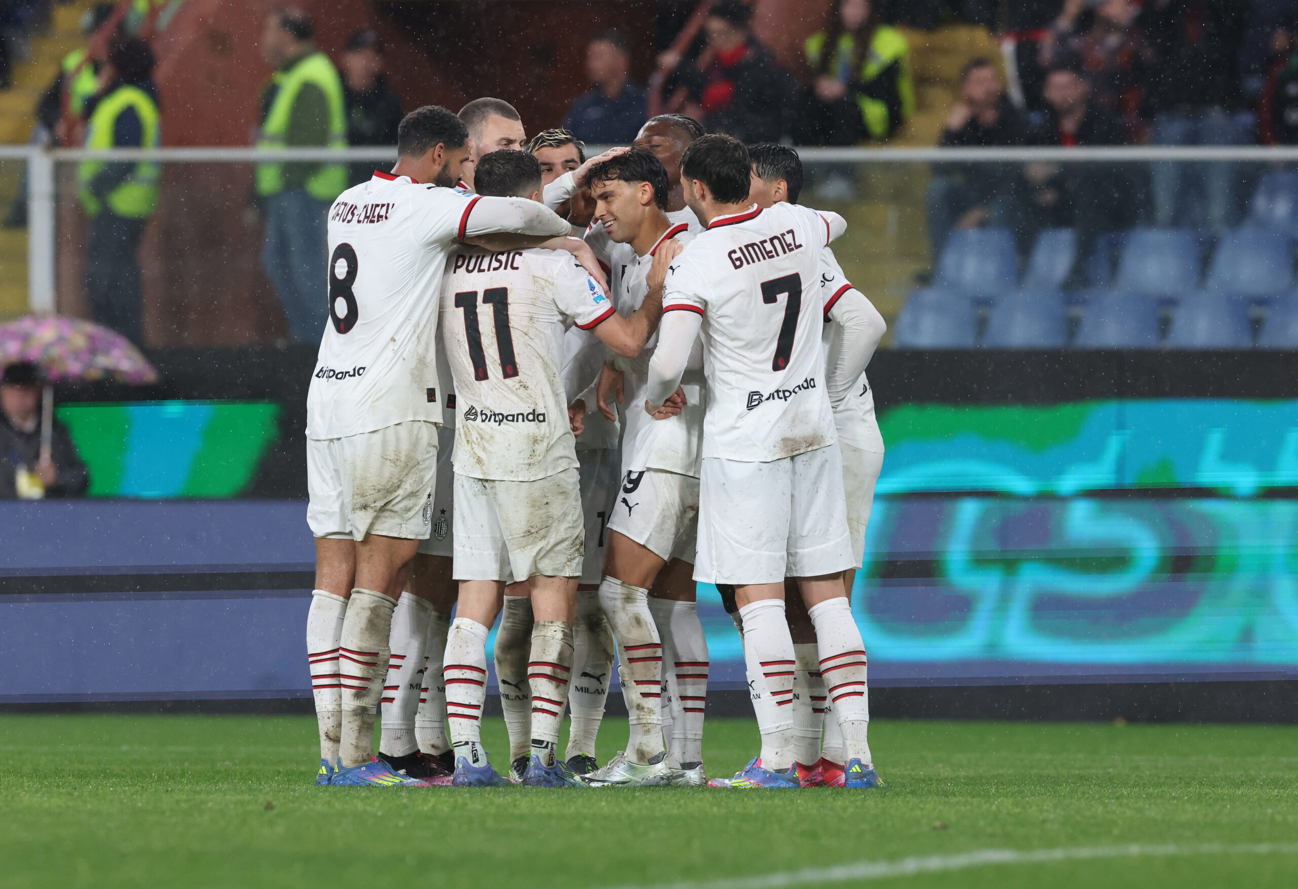 GENOA, ITALY - MAY 05: Joao Felix of AC Milan celebrates with team-mates after scoring the goal during the Serie A match between Genoa and AC Milan at Stadio Luigi Ferraris on May 05, 2025 in Genoa, Italy. (Photo by Claudio Villa/AC Milan via Getty Images)