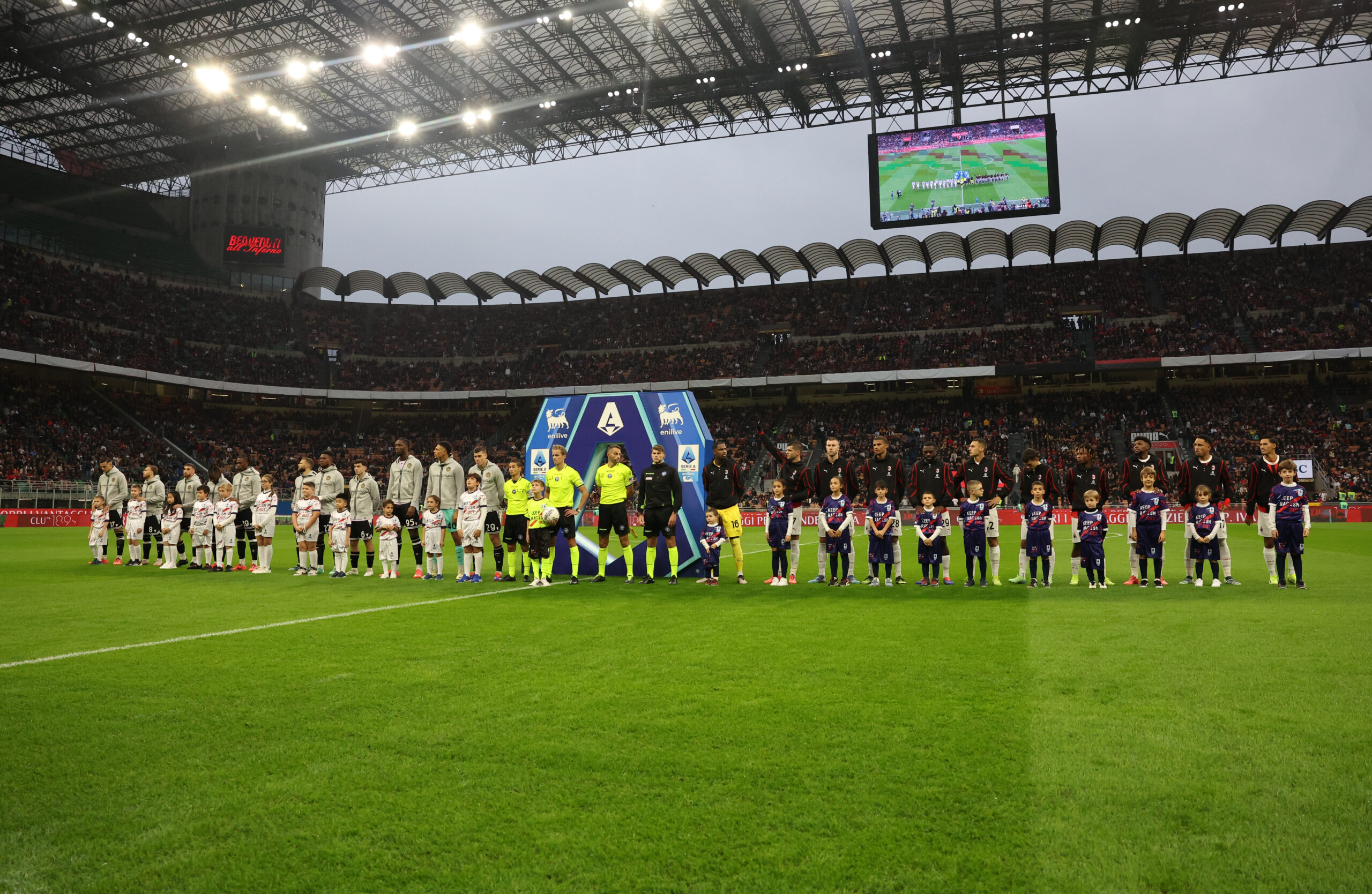 MILAN, ITALY - OCTOBER 19: Players of AC Milan line up prior to the Serie A match between Milan and Udinese at Stadio Giuseppe Meazza on October 19, 2024 in Milan, Italy. (Photo by Claudio Villa/AC Milan via Getty Images)