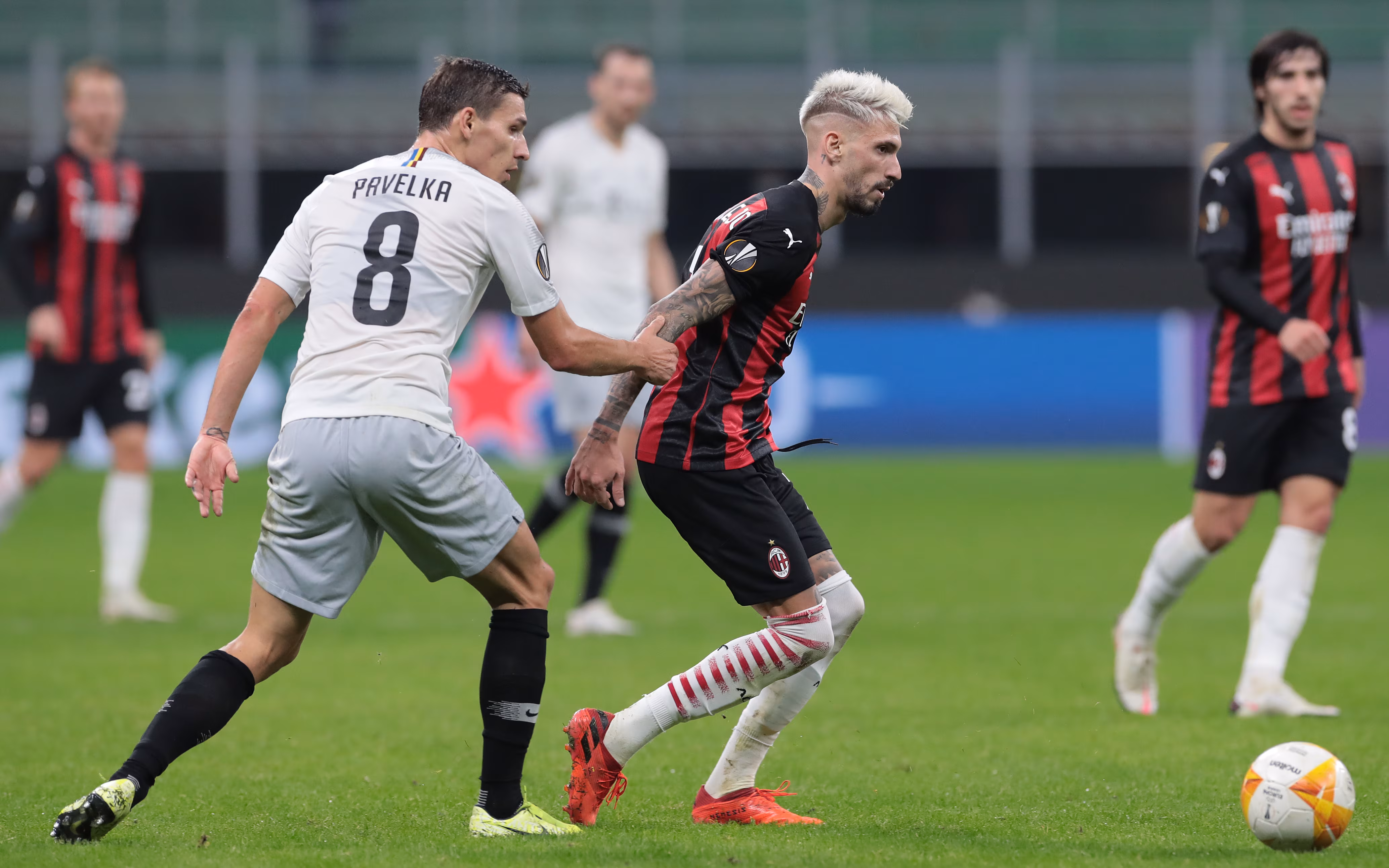 MILAN, ITALY - OCTOBER 29: Samuel Castillejo of AC Milan is challenged by David Pavelka of AC Sparta Praha during the UEFA Europa League Group H stage match between AC Milan and AC Sparta Praha at San Siro Stadium on October 29, 2020 in Milan, Italy. (Photo by Emilio Andreoli/Getty Images)